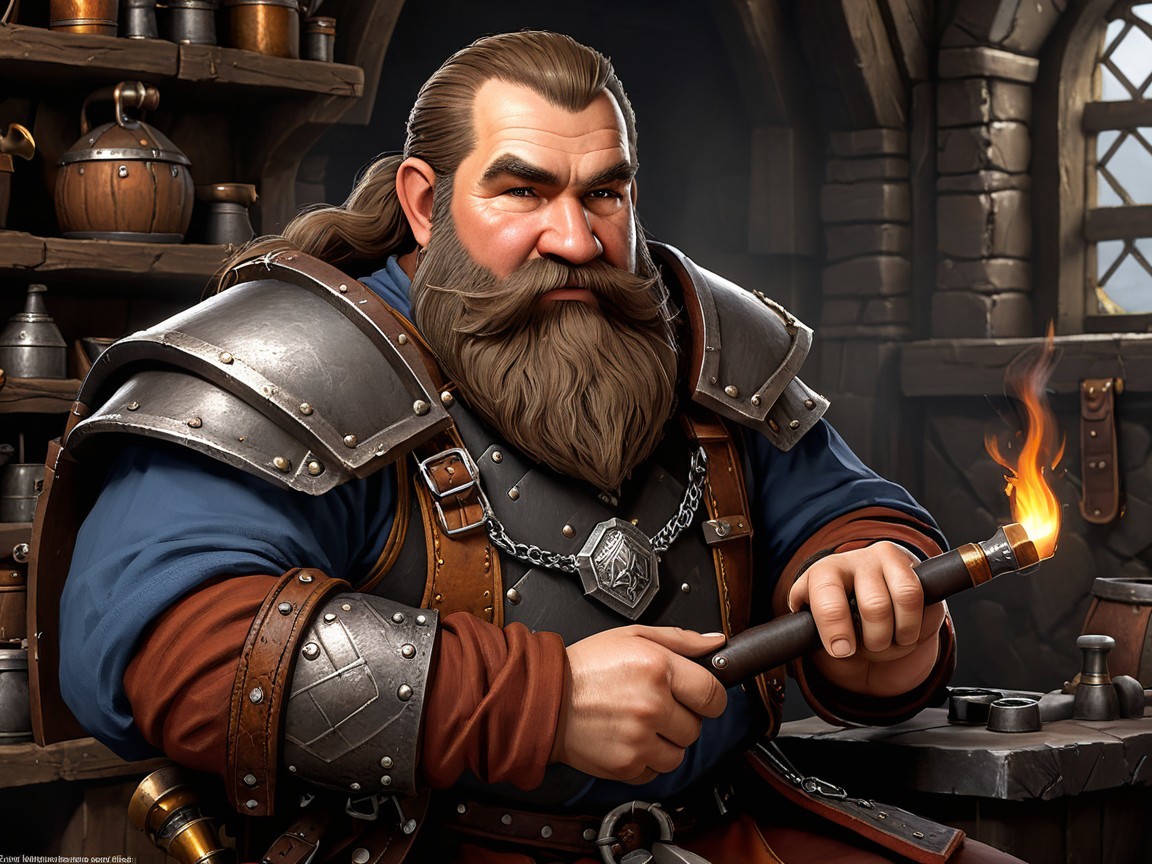 A burly dwarf with a thick beard sits in a workshop, wielding a torch. He wears silver armor and a blue tunic, surrounded by tools and materials, exuding a sense of craftsmanship and strength.