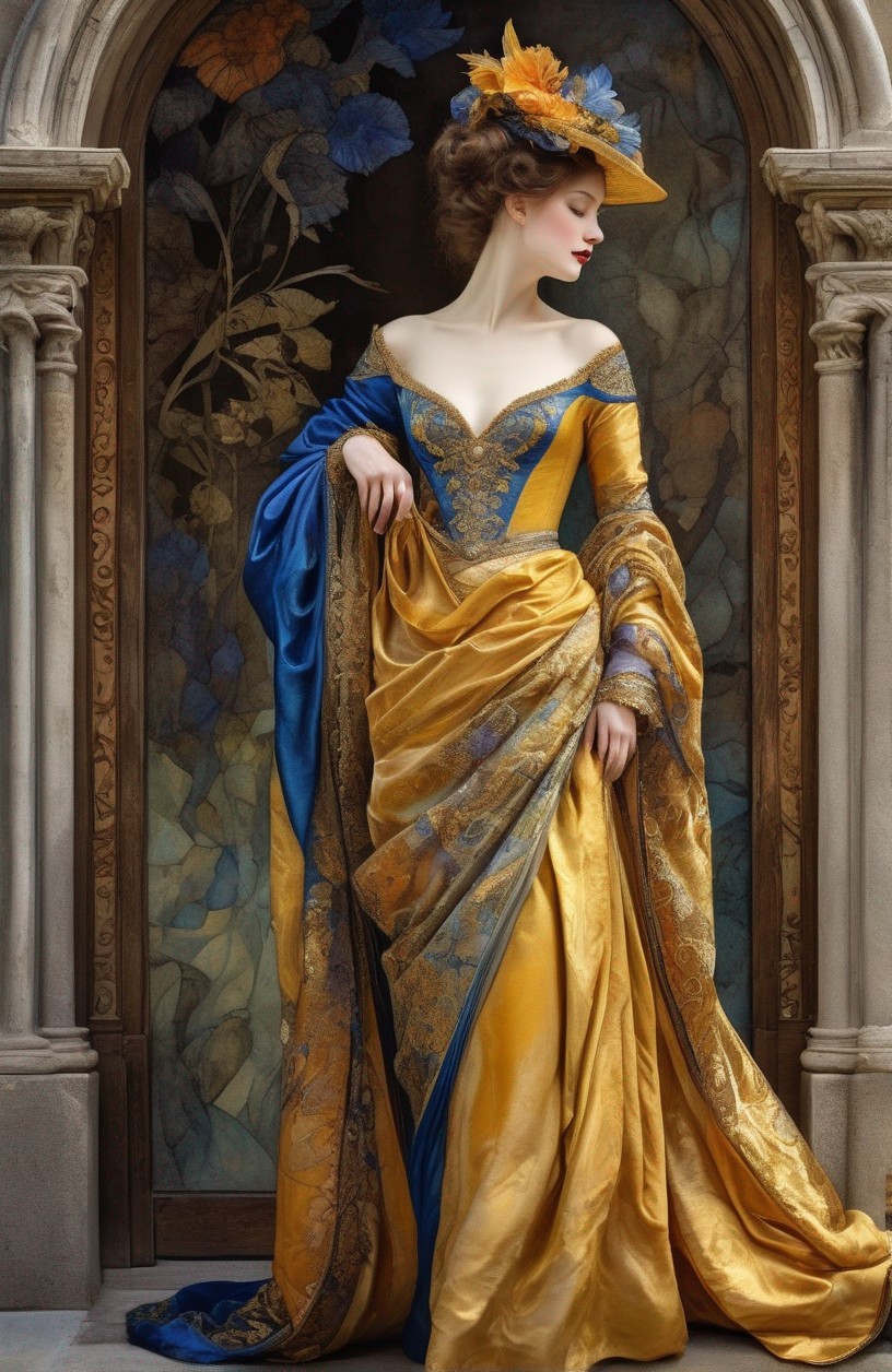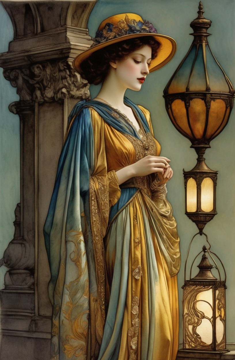 Single image. Venetian Art nouveau. The quantum nature of things. A Venetian carnivore. colors: silk iridescent texture in watercolor and ink, vibrant colors with gold foil detail metallic bronze, saffron, indigo, gold