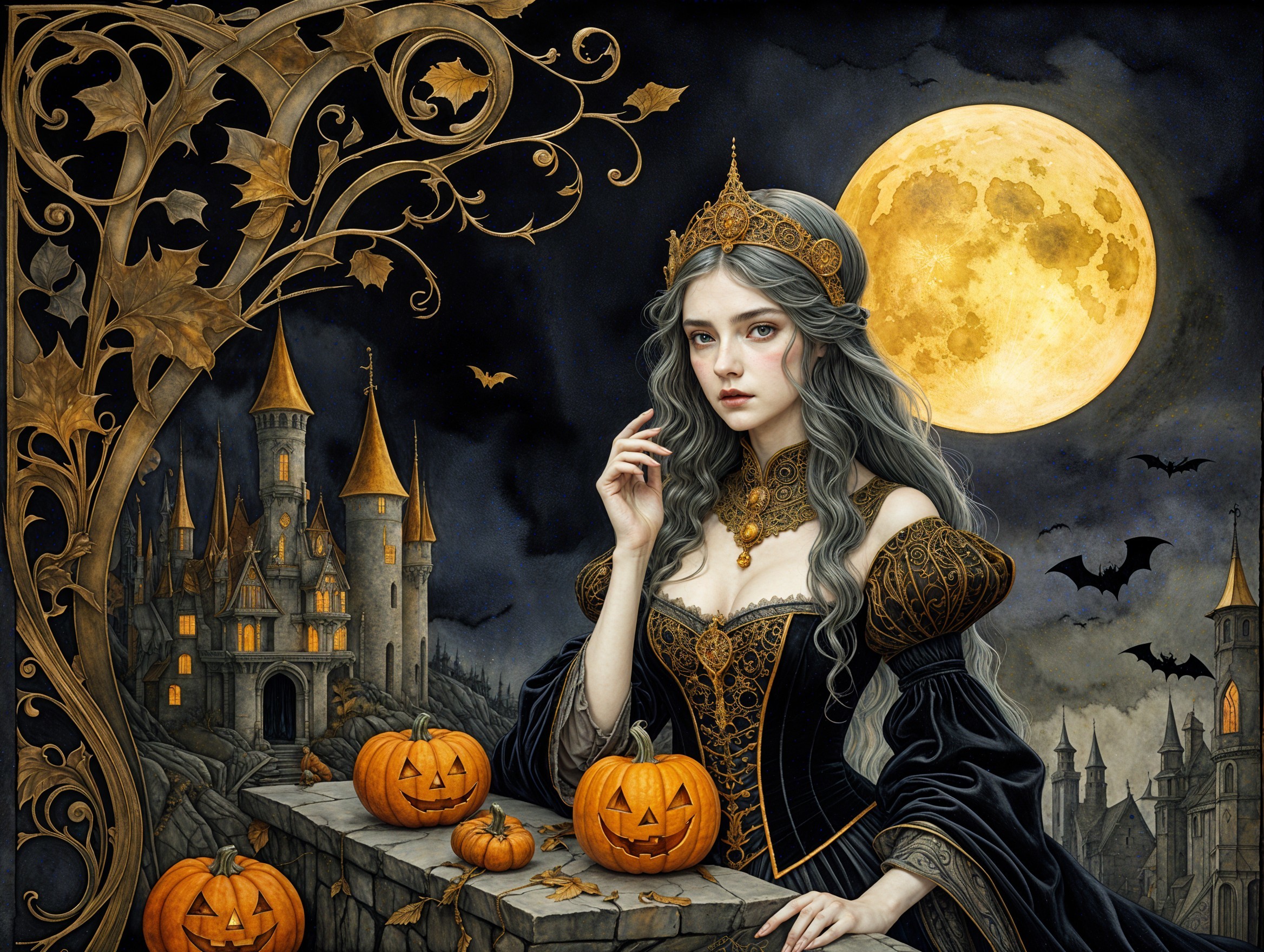 Legend of the Girl of the underworld. Halloween. Medieval Artists art nouveau Style, Velvet Black, Shabby, Dull Gold, Amber Gray, Golden Ratio, Surreal Fantasy, Elegant, High Definition Ultra Fine 3D Line, Zenangle Style, Watercolor Patchwork ,