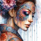 A close-up portrait of a woman with vibrant, artistic face paint featuring blue and pink hues. Water droplets adorn her face, enhancing the colorful design and creating a striking visual effect.