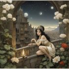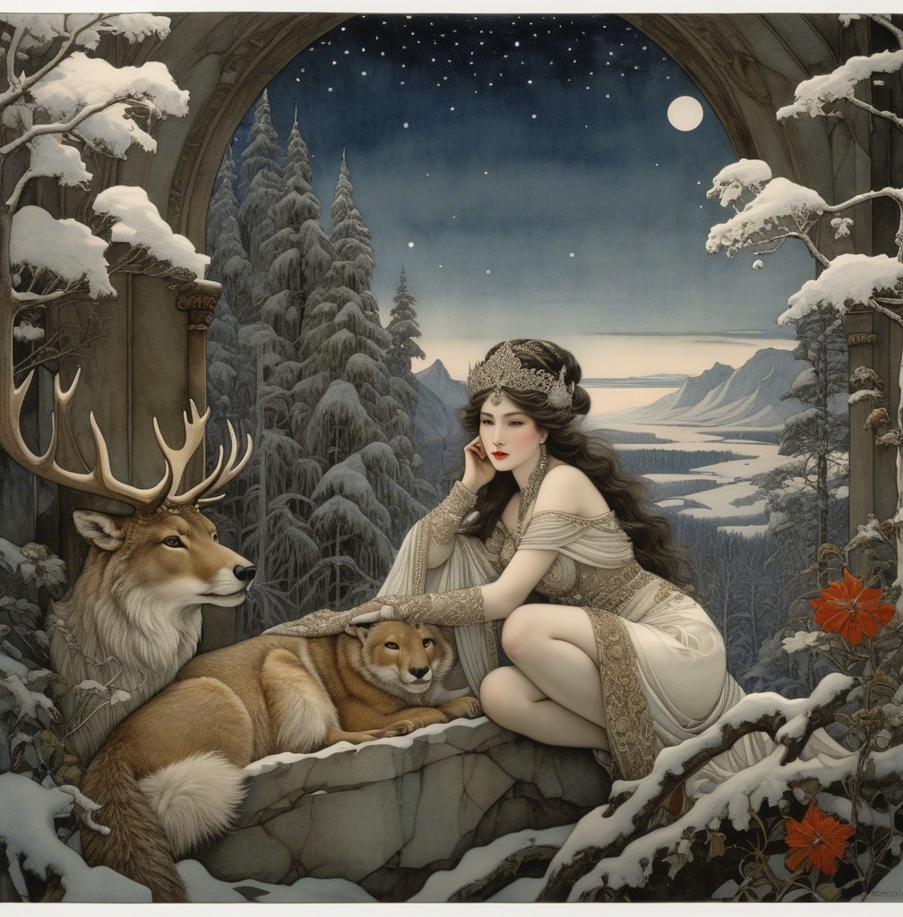 A serene winter scene features a graceful woman in a flowing gown, surrounded by majestic wolves. Snowy trees and a moonlit sky create a magical, tranquil atmosphere.