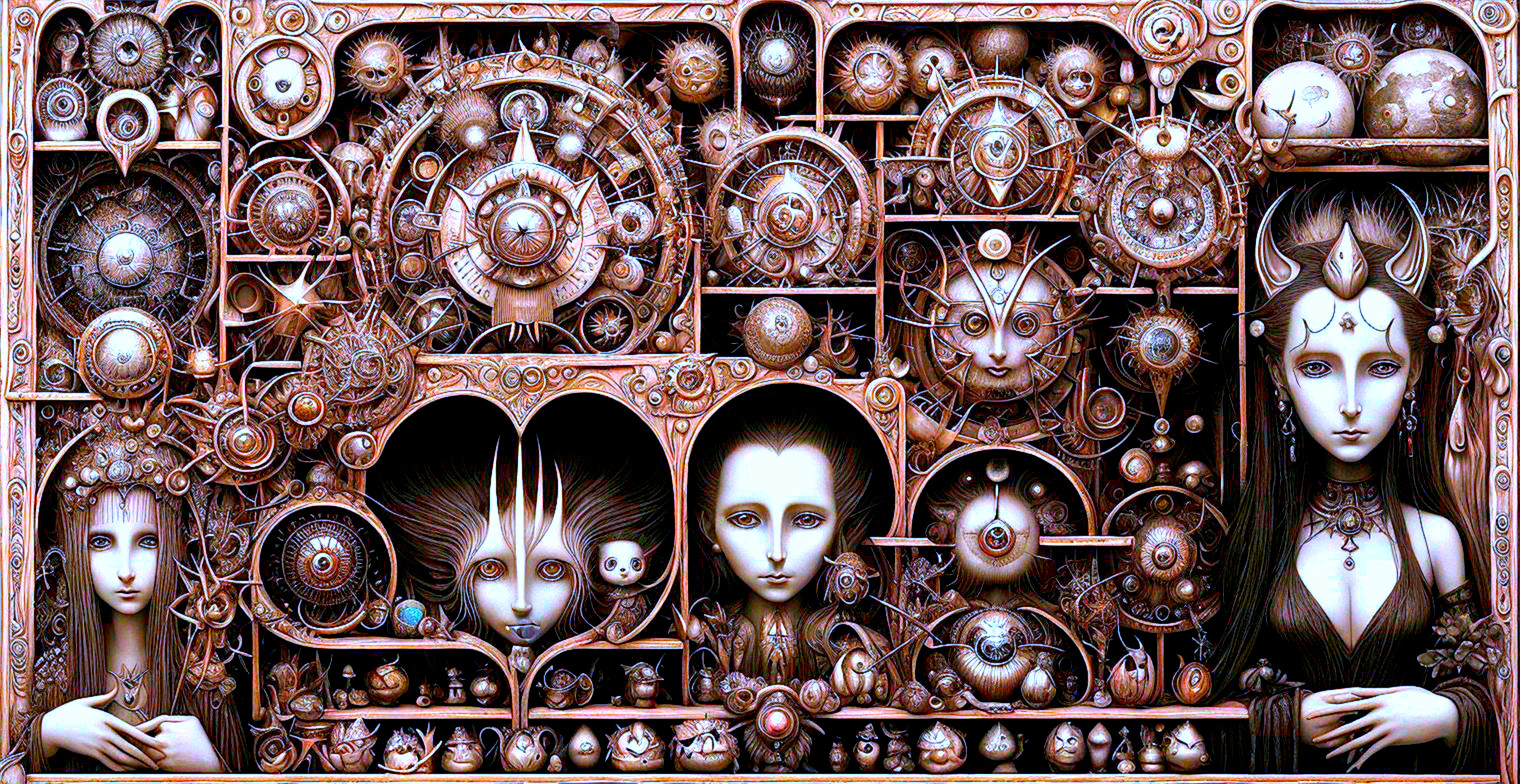 Symmetrical monochrome artwork with multiple female faces and fantastical elements