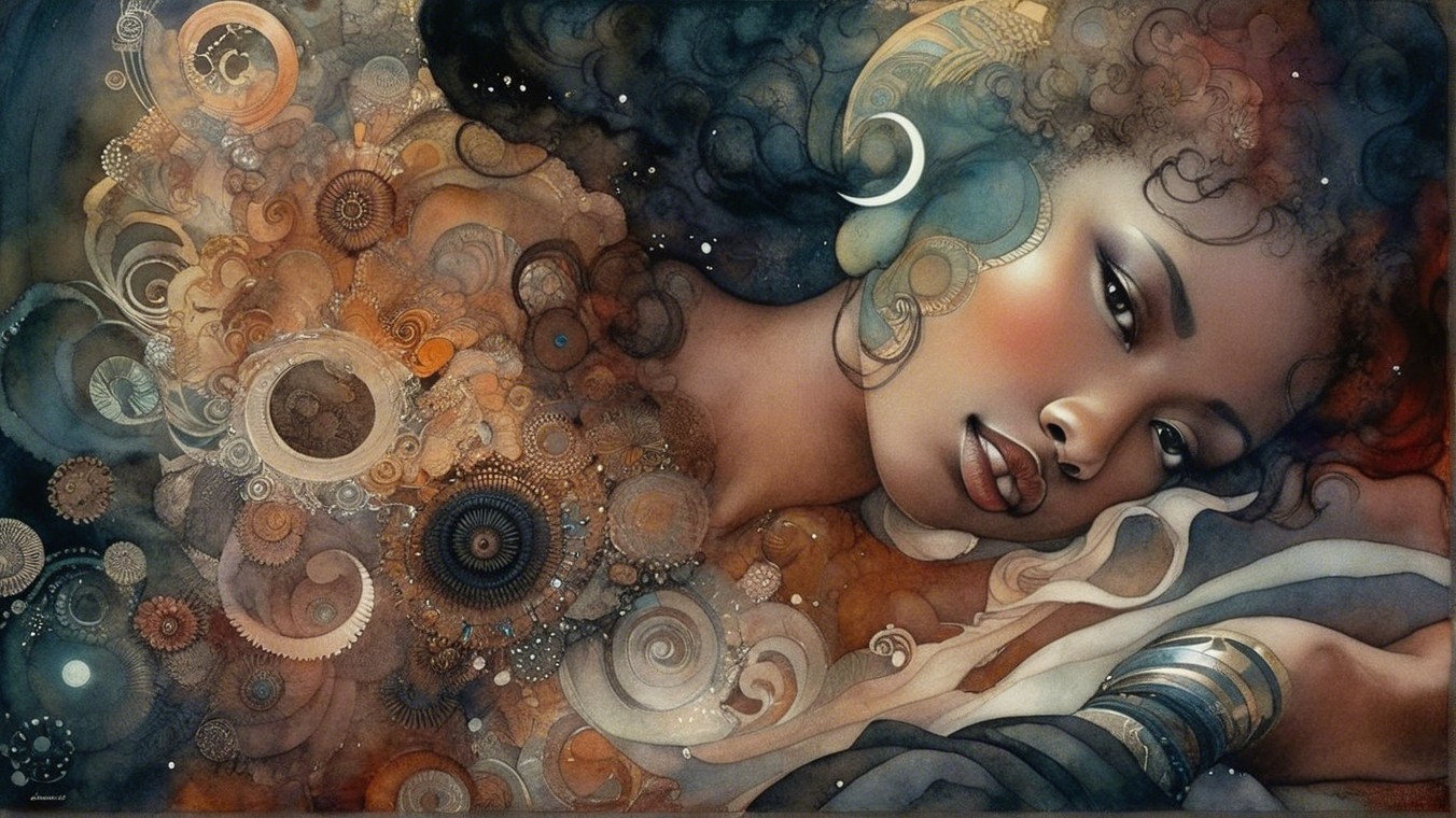 A stunning, ethereal portrait of a woman with beautiful curly hair, adorned in intricate jewelry, exuding elegance and strength against a backdrop of soft, flowing colors.