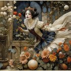 A graceful woman in a dark gown sits amidst autumn leaves and pumpkins, framed by gothic windows. Soft light illuminates her serene expression, exuding a hauntingly elegant vibe.