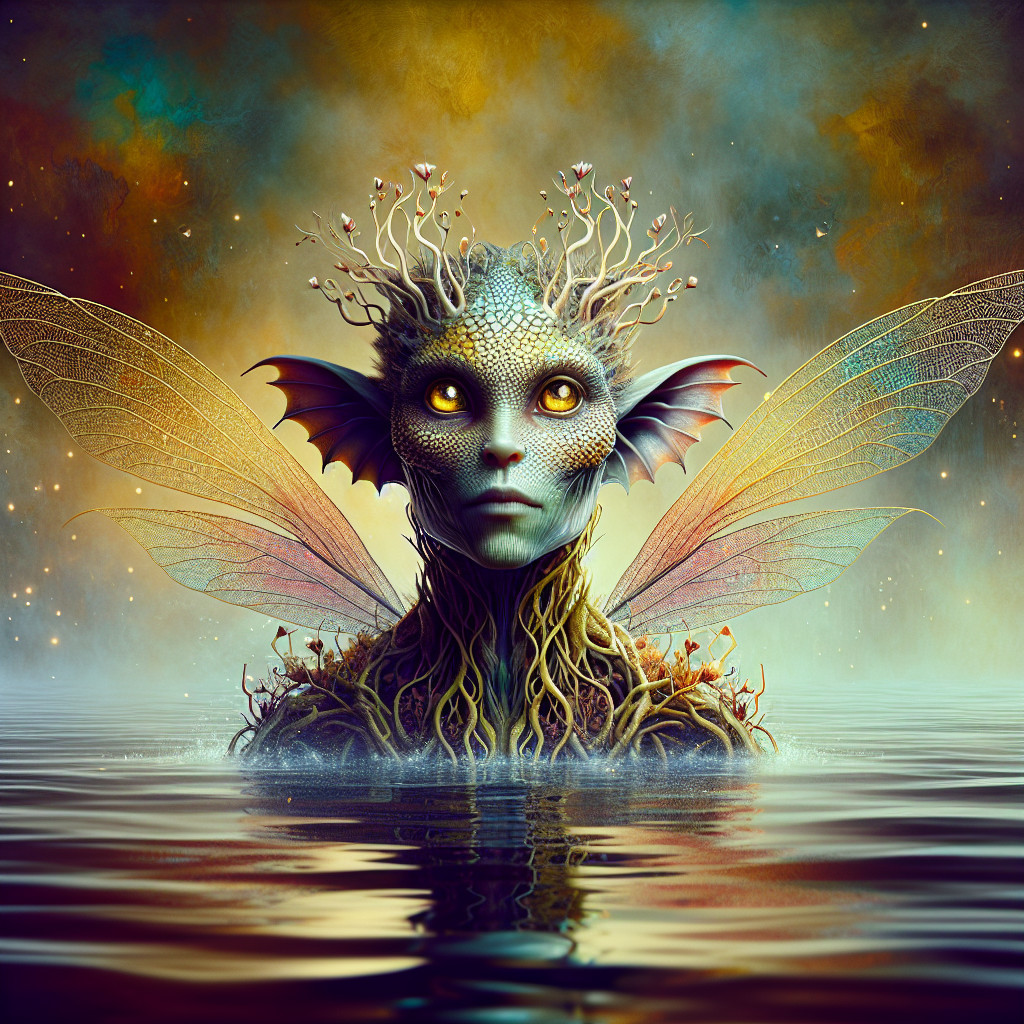 A serene fairy with delicate golden wings emerges from a shimmering pool, adorned with floral accents. Her ethereal features glow softly against a mystical, enchanted backdrop.