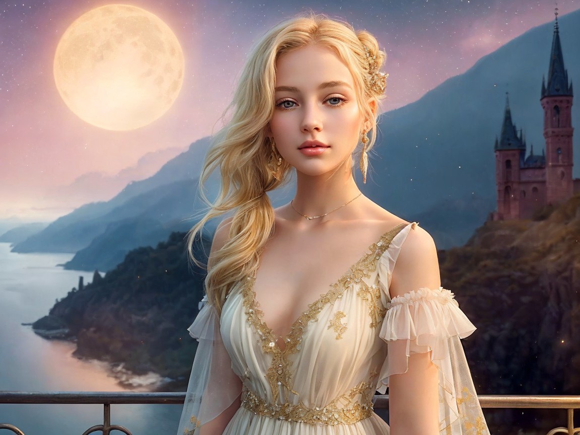 A serene young woman in a golden-embellished gown stands against a mystical landscape, featuring a glowing full moon and a distant castle nestled among mountains and a tranquil lake.