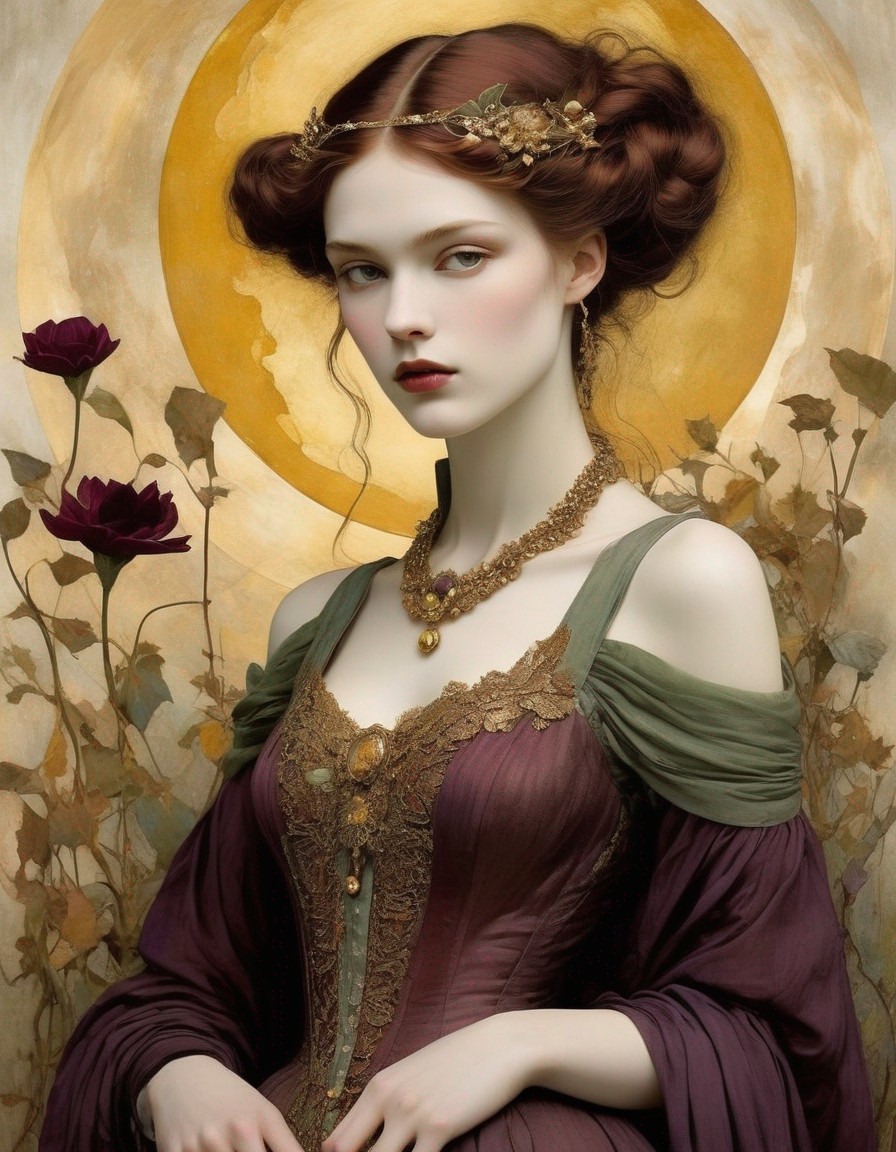 An ethereal woman with a golden halo, adorned with floral headpiece and vintage dress, among fluttering birds and blossoms.