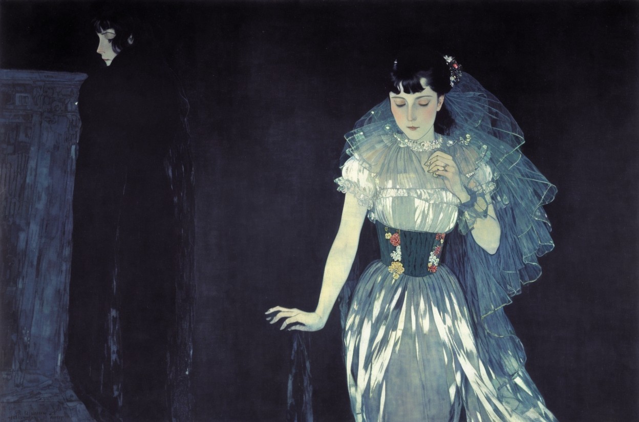 The image features a woman in a flowing, elegant gown, seemingly lost in thought. A shadowy figure looms behind her, adding an air of mystery and tension to the scene.