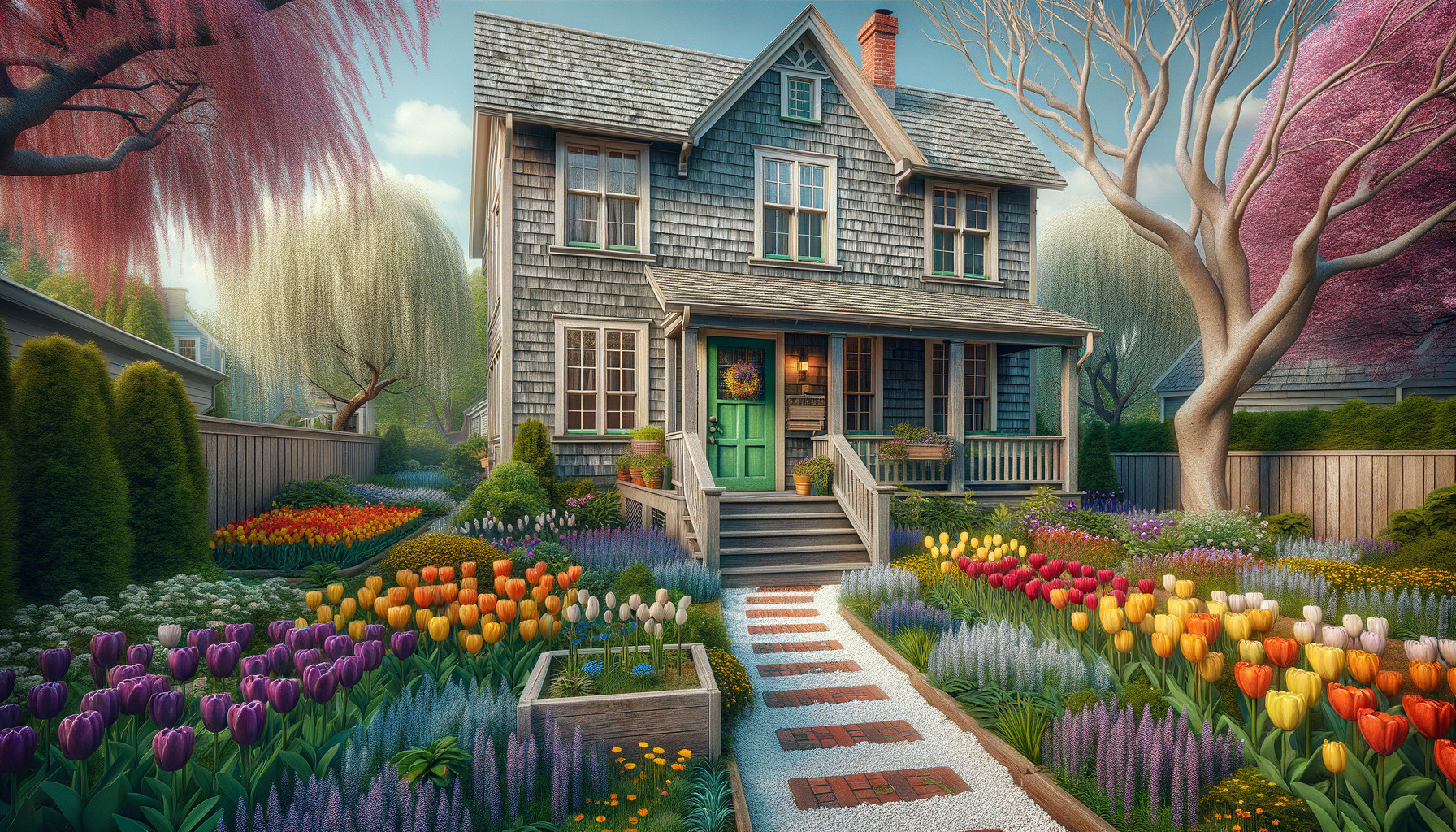 A charming Victorian house amid a vibrant garden with lush flowers, a well-kept lawn, and a welcoming pathway in a serene setting.