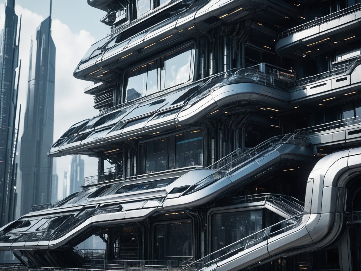 A striking futuristic architecture showcases sleek, layered structures with a metallic finish, set against a backdrop of towering glass skyscrapers and a clear blue sky, evoking a sci-fi metropolis.