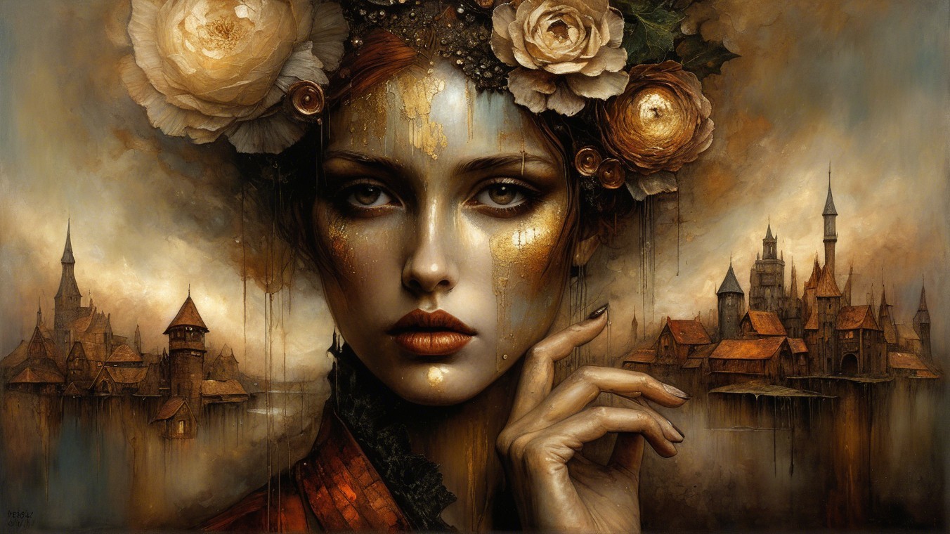 A surreal portrait of a woman with striking features, adorned with golden orbs and intricate patterns. The backdrop features a dreamy landscape, enhancing the mystical atmosphere.