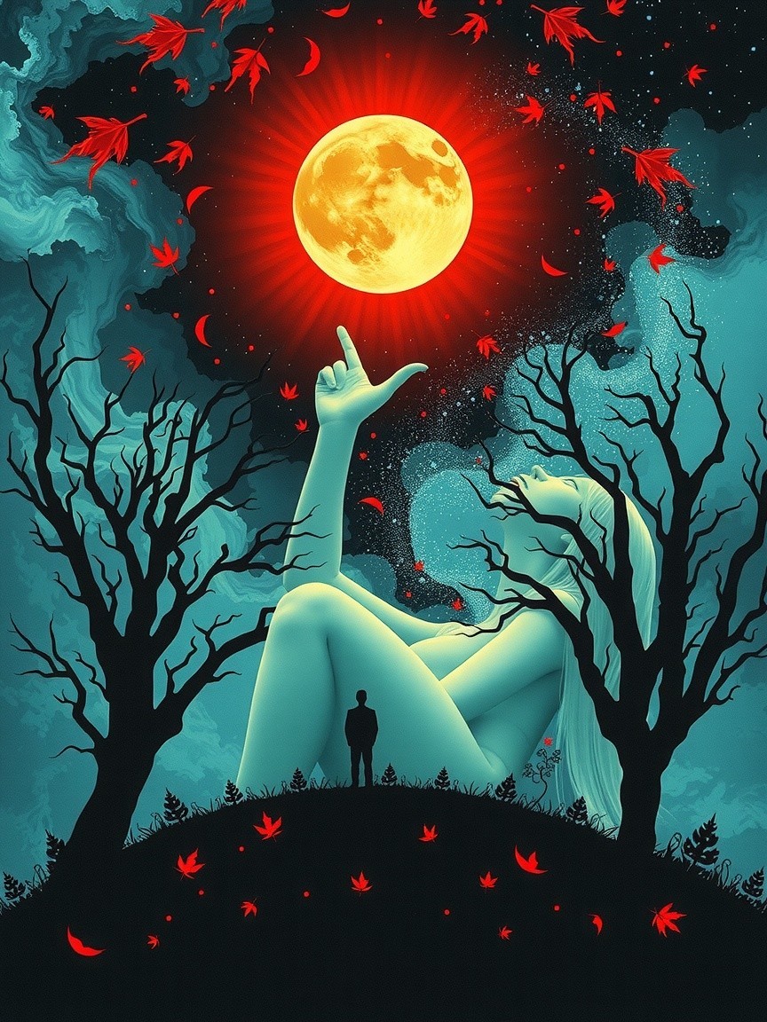 Couple Silhouetted Against Orange Full Moon at Night