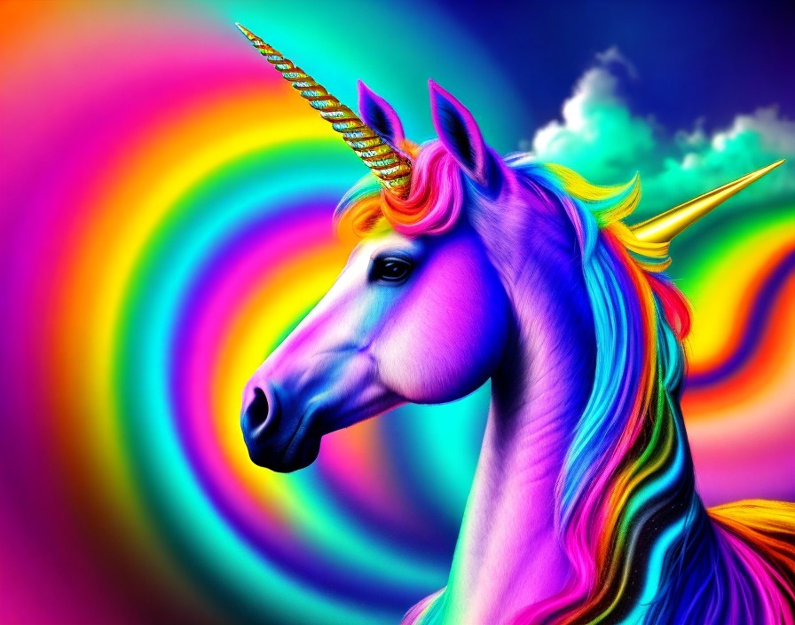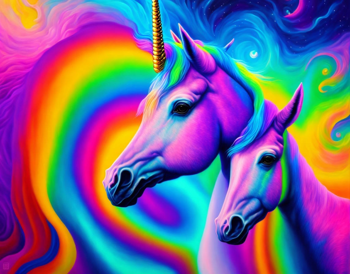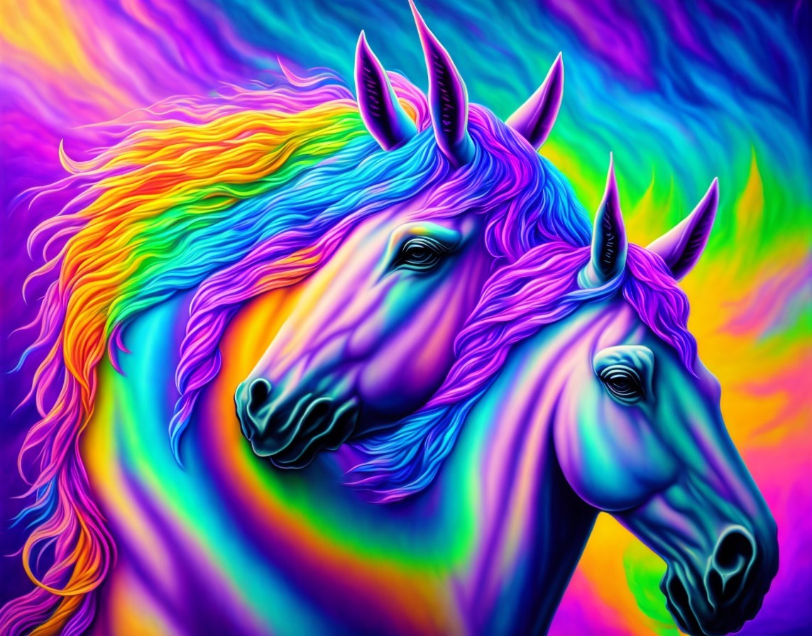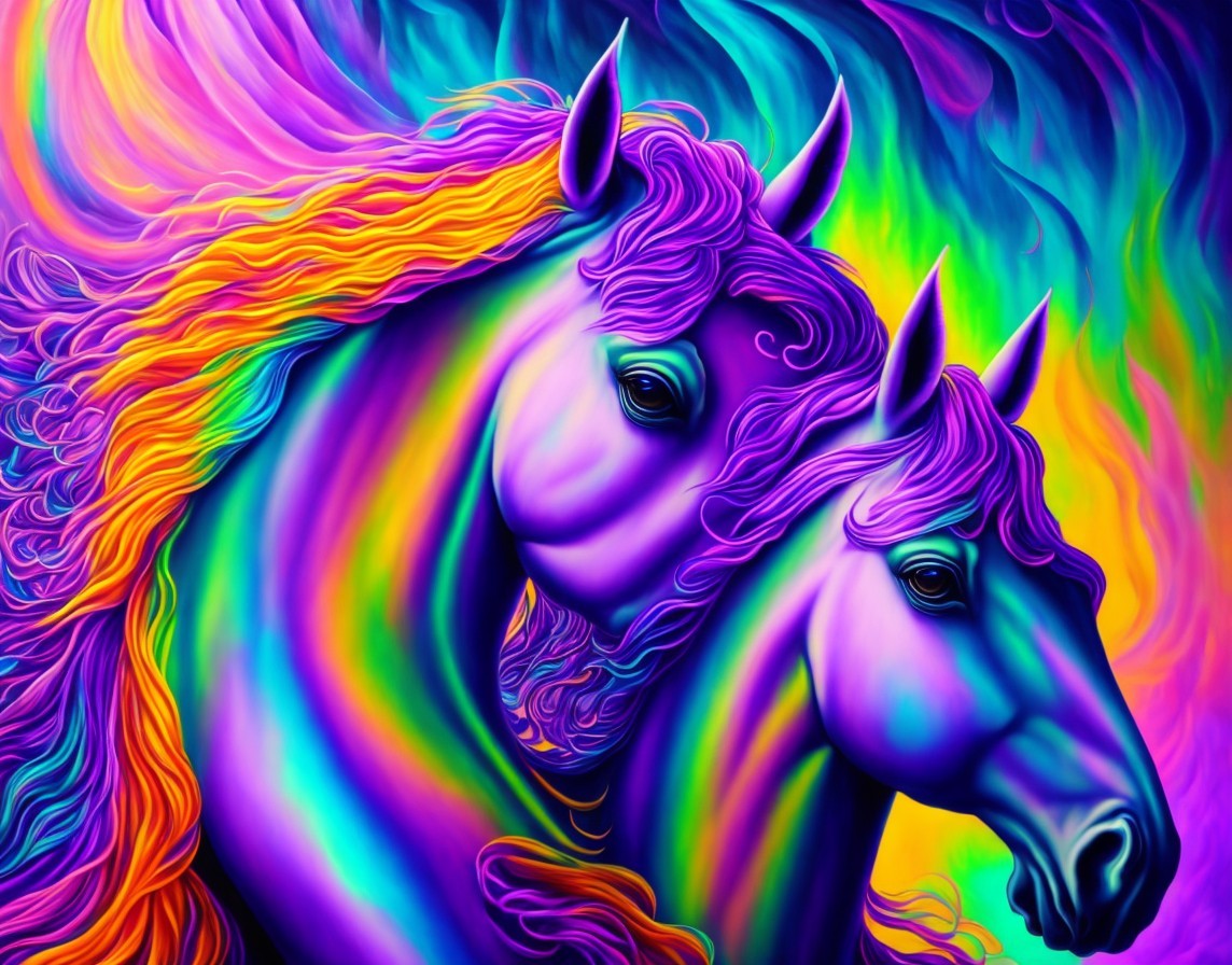 Vibrantly colored painting of a mystical unicorn with flowing mane in hues of purple, blue, and orange against a psychedelic background.