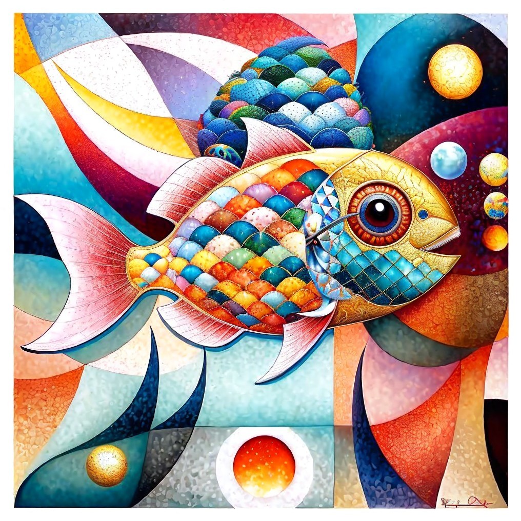 A vibrant, colorful artwork featuring a stylized fish with detailed patterns, surrounded by abstract, wavy shapes and bubbles.