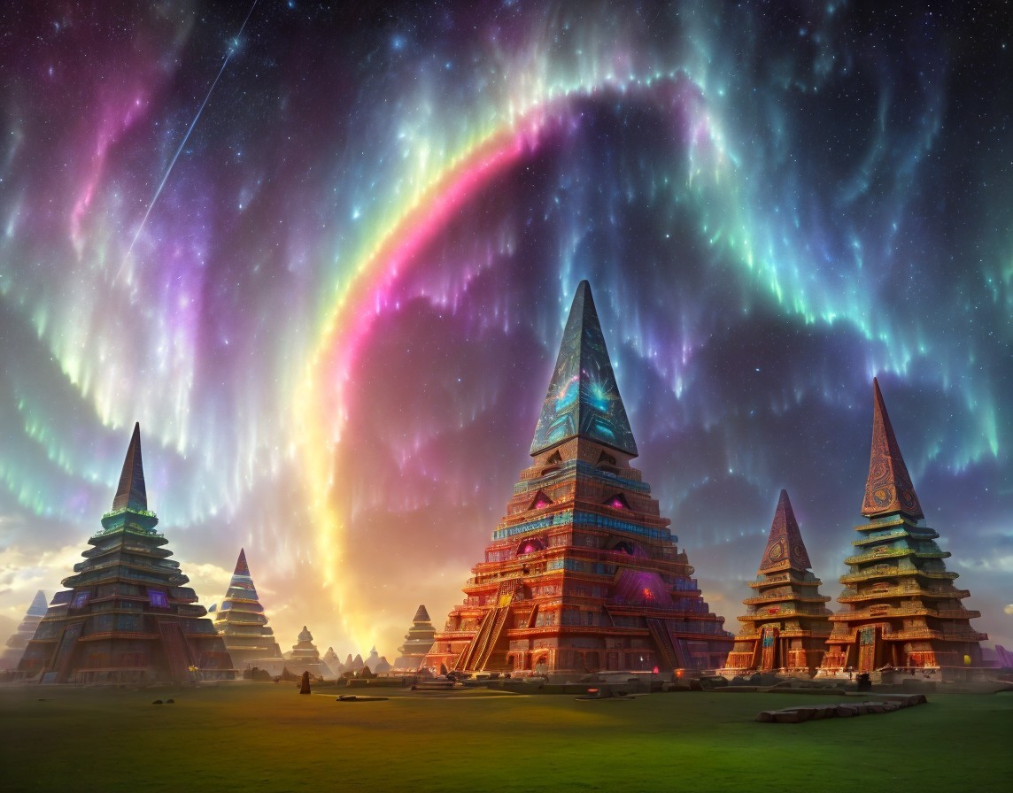 Prompt: "Imagine a vibrant alien pyramid plaza with a hypnotic cosmic wormhole, its stone structure adorned in intricate patterns. Above, cloudy nebulas and spectral stars fill the sky, casting a dreamy atmosphere. Waterfalls flow near giant bonsai trees, creating a surreal scene. Infuse the setting with psychedelic visionary art, merging psytrance and shamanic DMT styles, and overlay vibrant geometric patterns for an otherworldly, cosmic masterpiece."