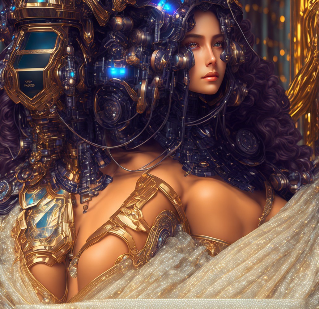 Detailed 3D Illustration of Woman in Golden Armor with Mechanical Adornments