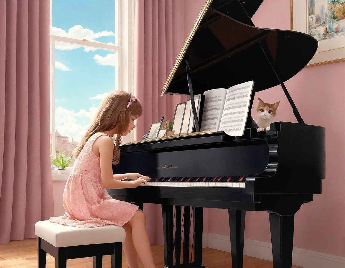 Prompt: "a very cute beautiful girl playing a piano and singing enthusiastically along with a cat sitting on the piano listening to the tune, Beryl Cook, Gabriel Pacheco, Nancy Noel, Anna Silivonchik, Ken Fulk, Chris Sanders, impasto, fine art, 3d, soft colors watercolors and ink, beautiful, fantastic view, extremely detailed, intricate, best quality, highest definition, rich colours."