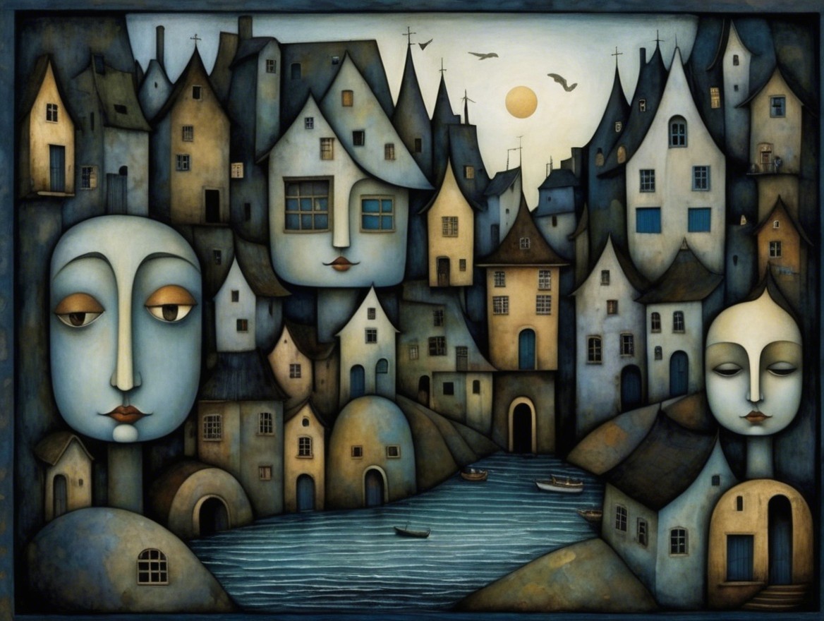 The artwork features an enchanting village with whimsical, oversized faces and uniquely shaped houses, basking in twilight hues. A serene river flows through, with small boats and figures.