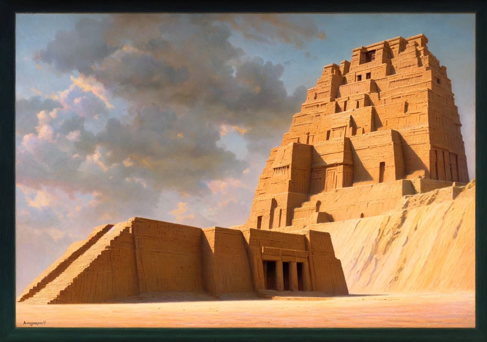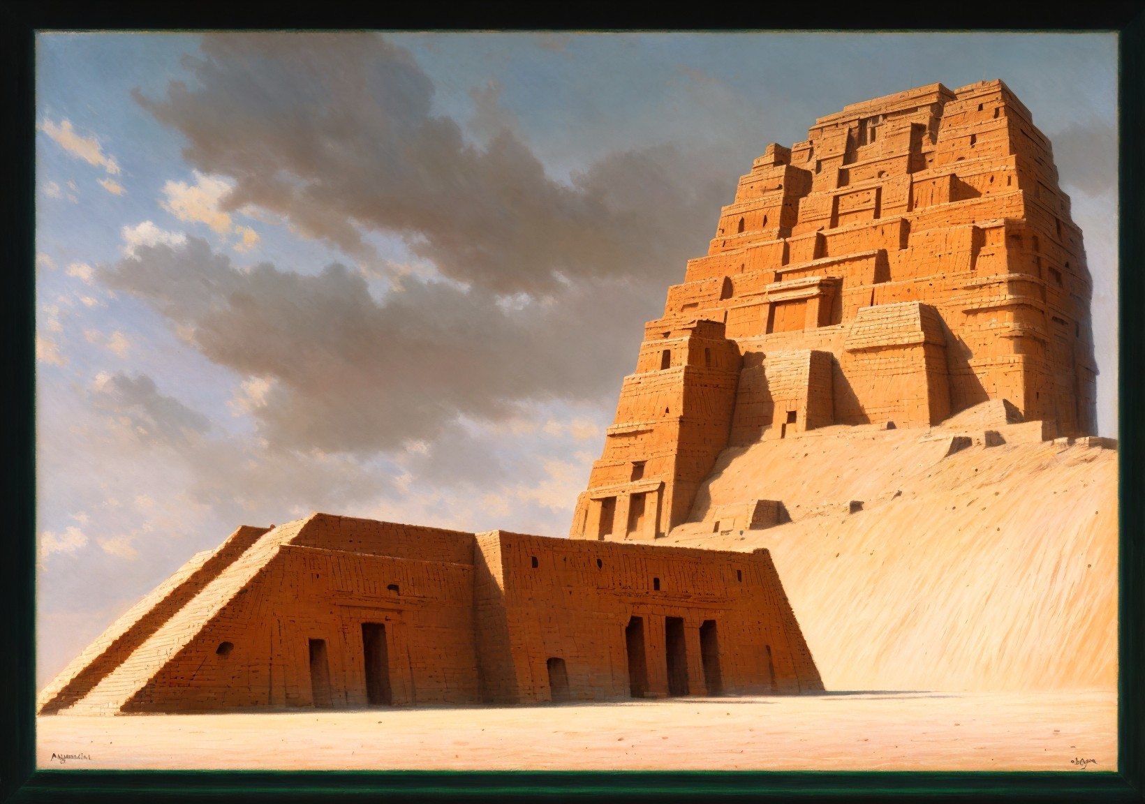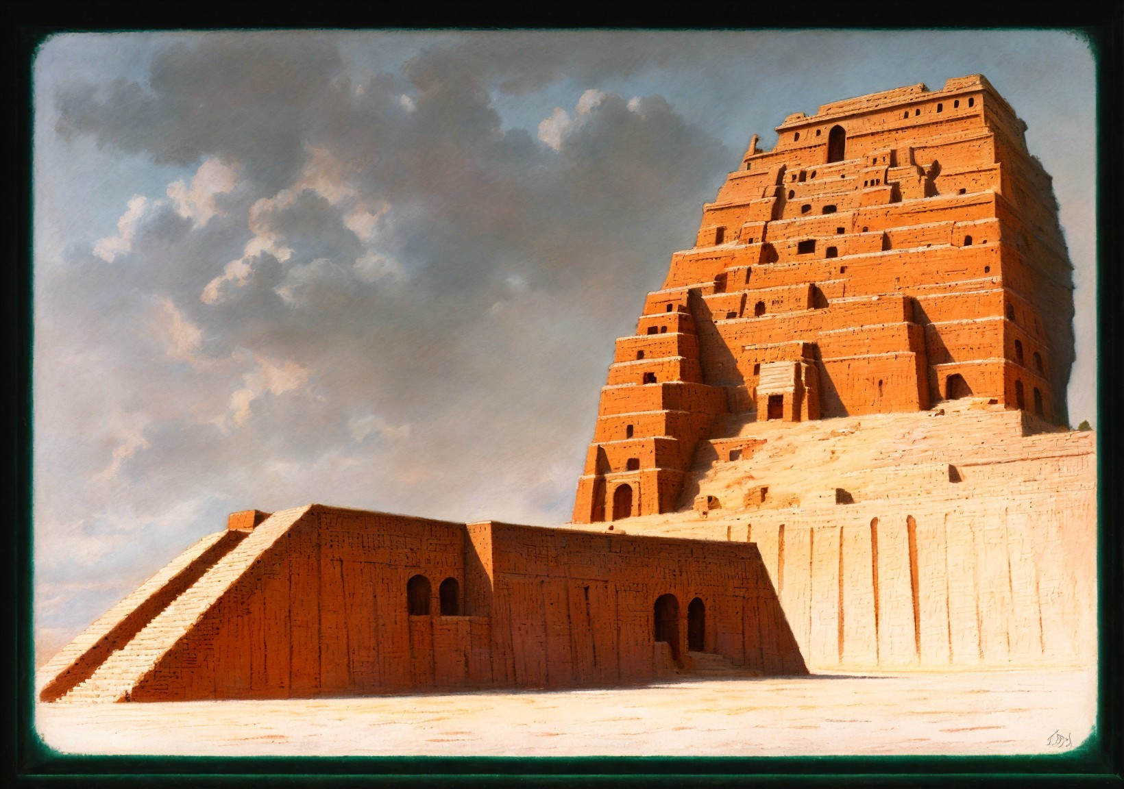 + Prompt:Impressionism painting of an ancient Ziggurat of Agargouf. Drawn in a style of impressionism by dry pastels with dynamic, thick strokes on a paper.