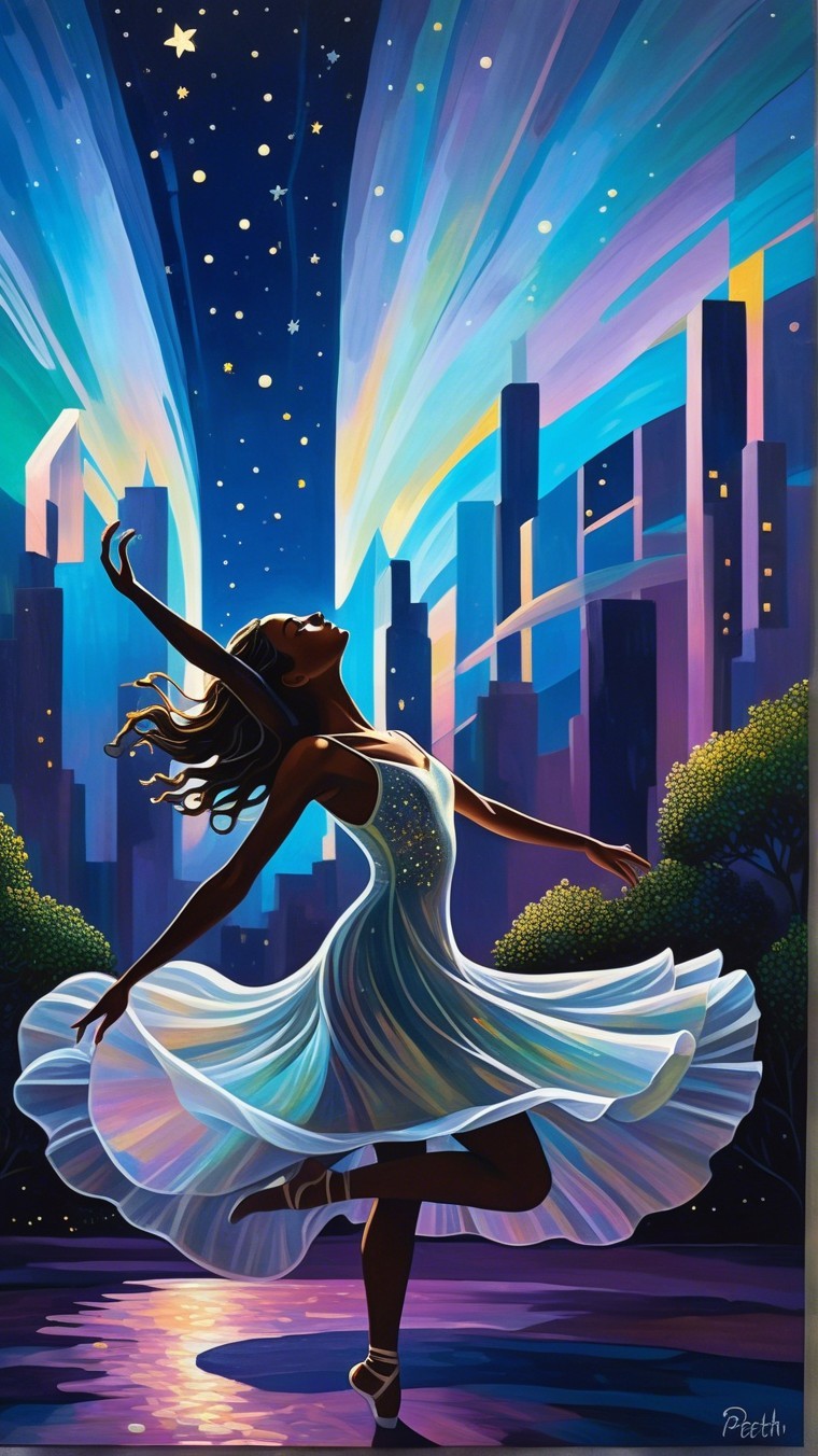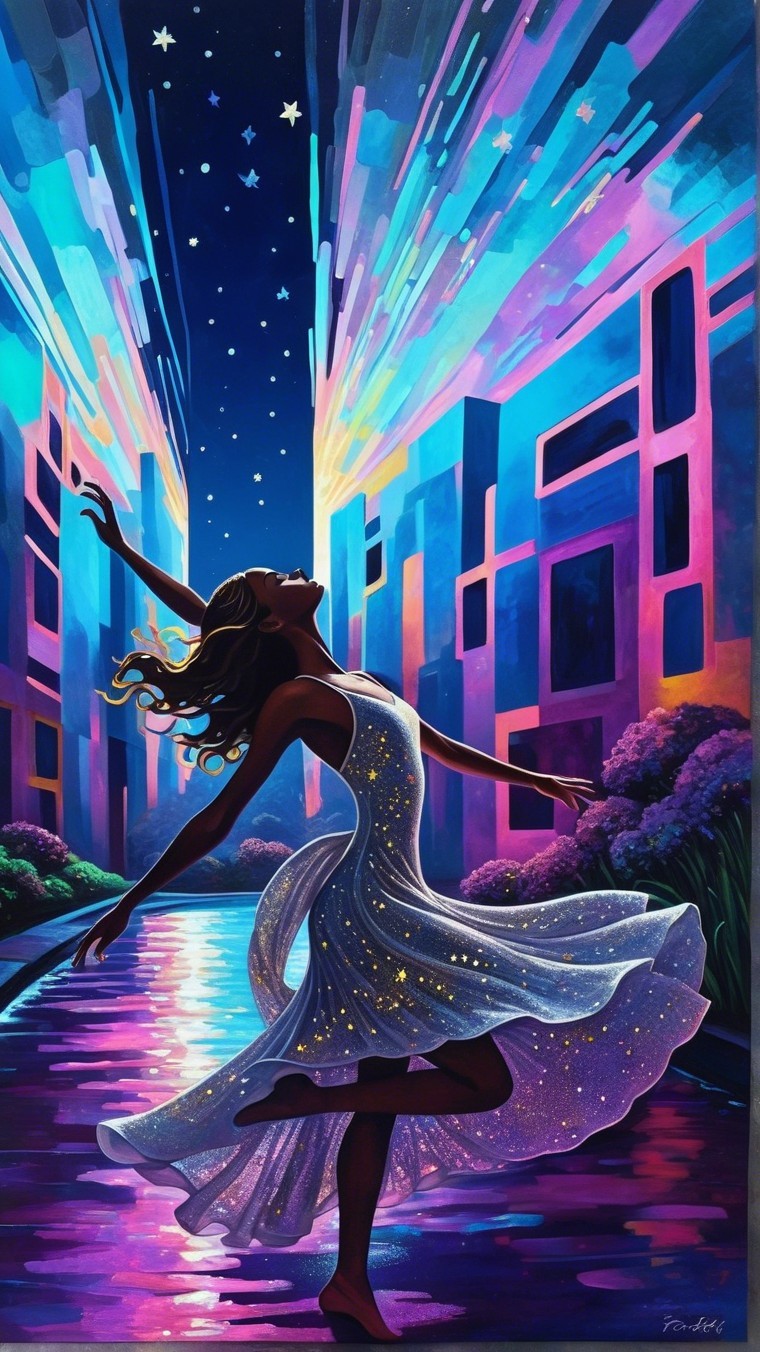 A graceful figure twirls in a flowing white dress, illuminated by a starry night sky and a crescent moon. Surrounded by tall structures and lush greenery, she exudes joy and freedom.