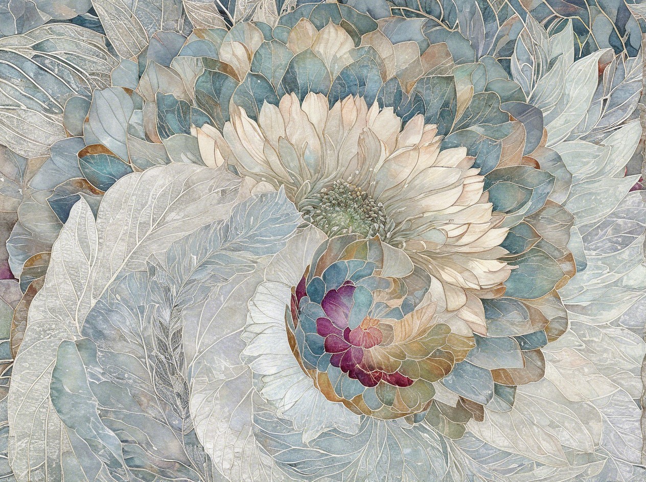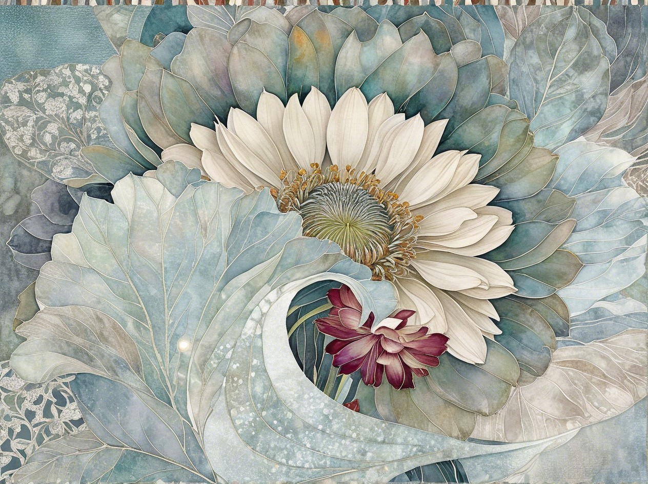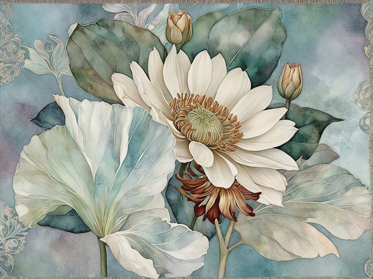 A beautiful arrangement of white and soft pink flowers with intricate detailing, surrounded by lush green leaves. The background features a gentle, muted blue, enhancing the floral elegance.