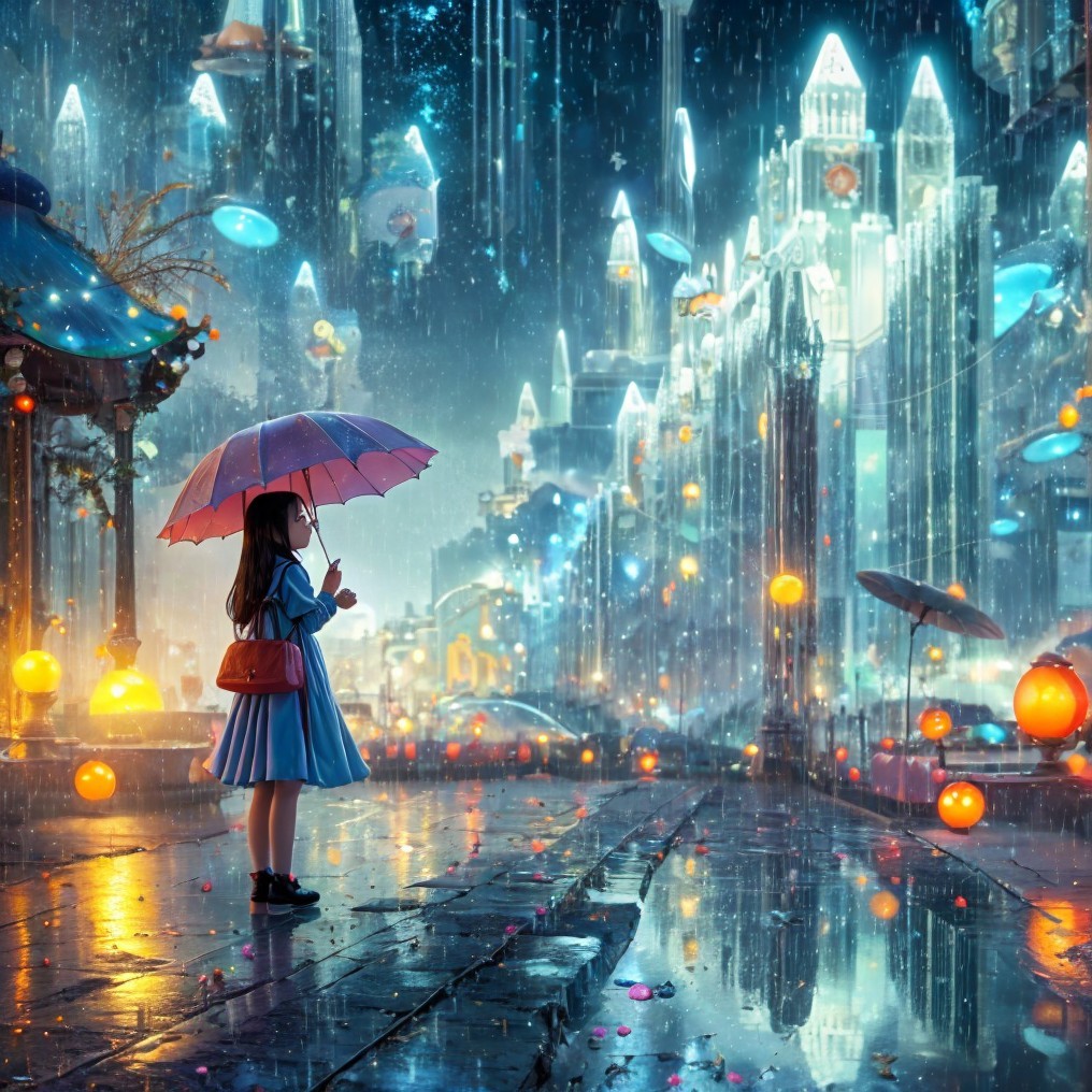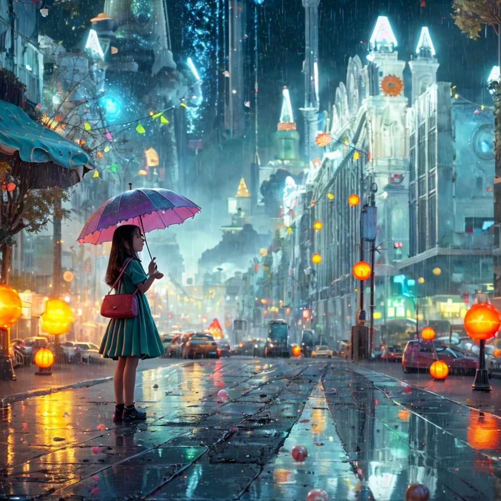 + Prompt:Apocalipsis futurista , Roma cubierta notas musicales , fantasía mago de Oz, lámparas naranjas flotan chino , niña con osito azul de juguete ,sueño mojado con reflejos de la lluvia