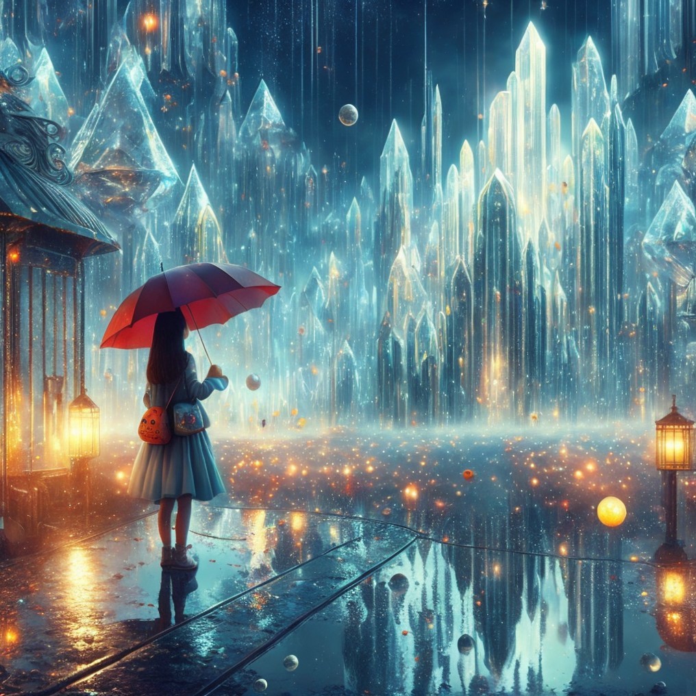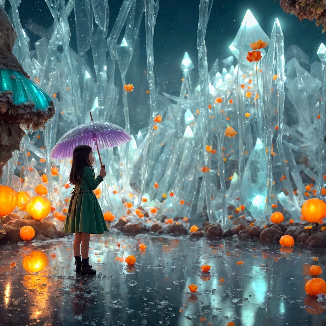 Prompt: Tulipanes de hielo en el suelo , Apocalipsis futurista , Roma cubierta notas musicales , fantasía mago de Oz, lámparas naranjas flotan chino , niña pulpo verde de juguete ,sueño mojado con reflejos de la lluvia