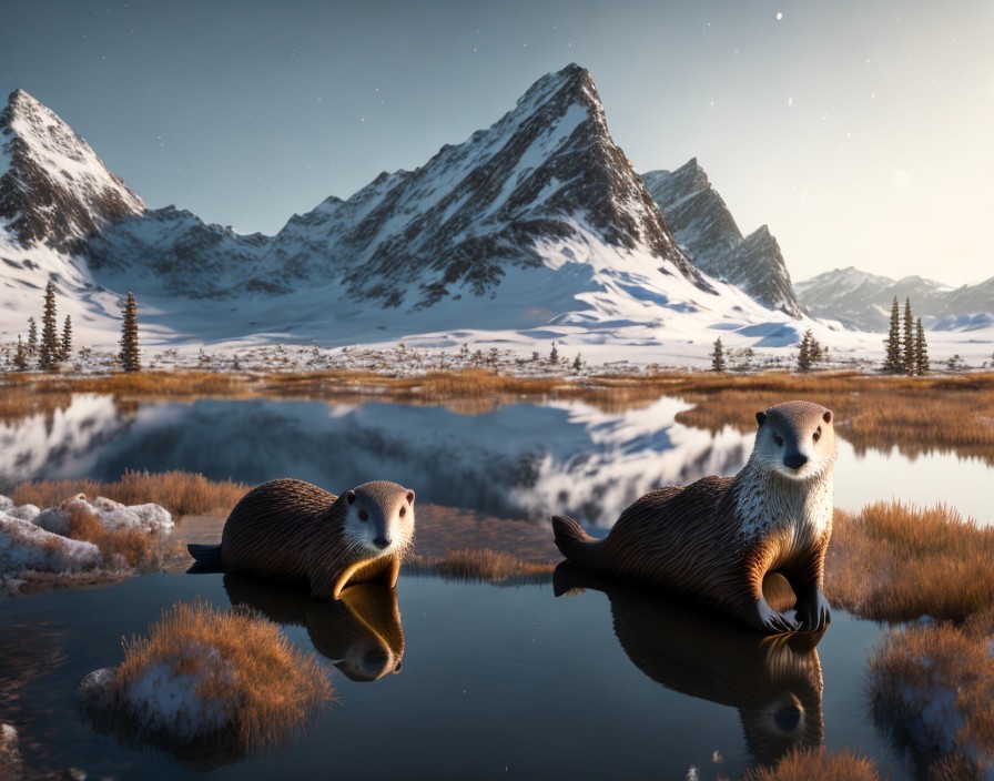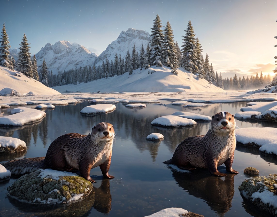 Two otters in a snowy landscape with pine trees and mountains in the background, under a clear blue sky.