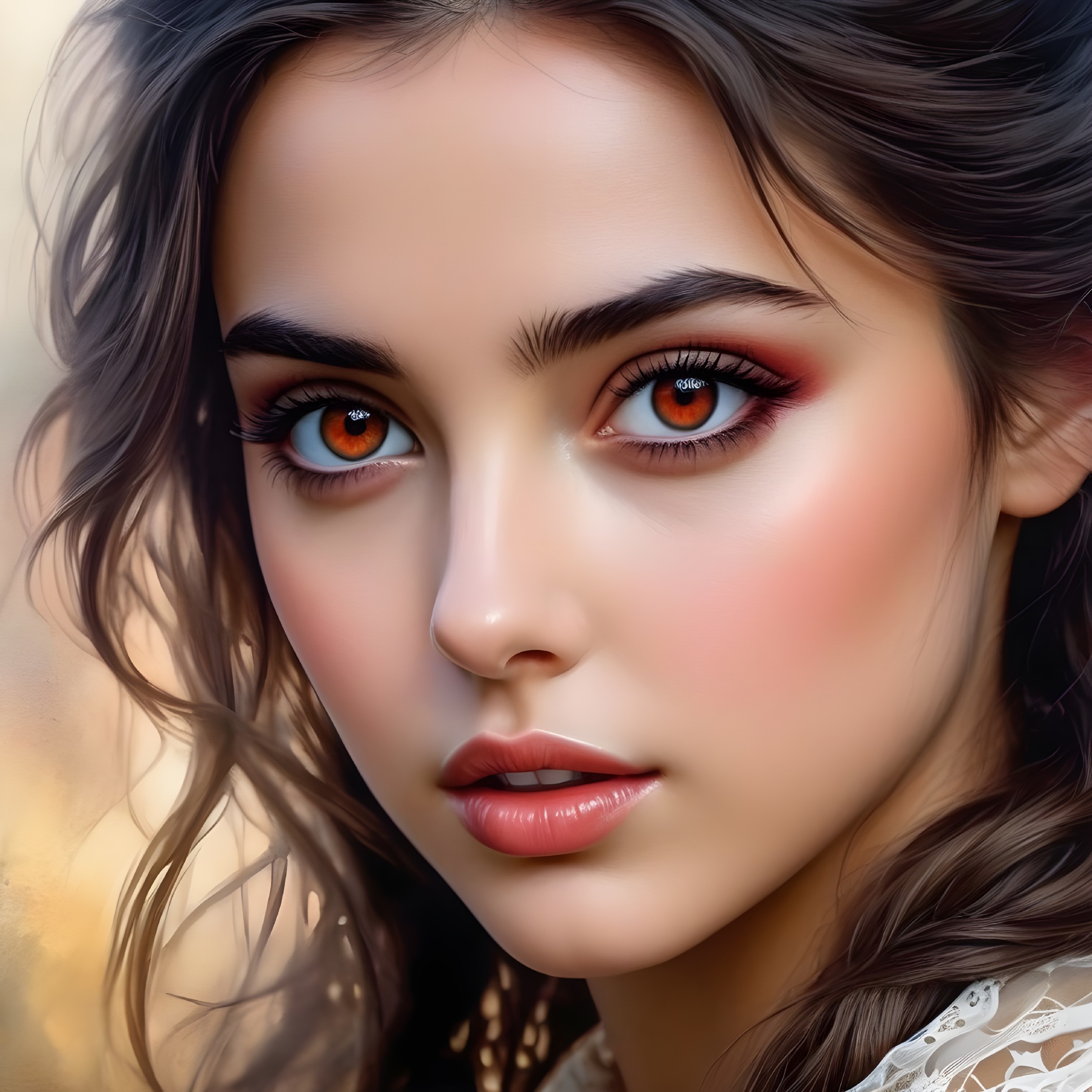 A close-up portrait of a young woman with striking features, featuring a blend of warm and cool tones in her makeup. Her expressive eyes, one brown and the other blue, draw attention against a soft background.