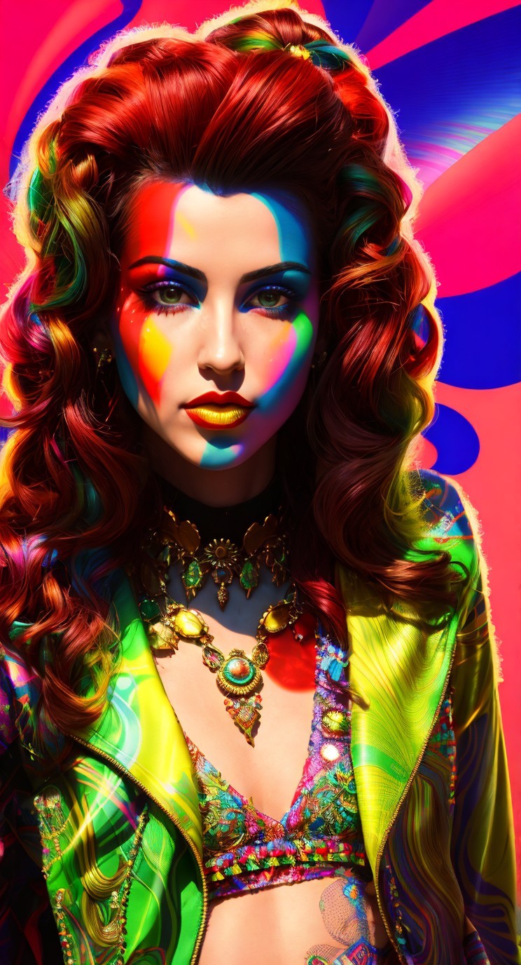Prompt:  "Pop art style,  pompous portraiture,  female enchantress,  silk, cotton, intricately multilayered, mutated, divine, enlighted, triadic color scheme red blue green,  fauvistic cuts, encaustic strokes,  sweat, stylized lineage illustration, brightness 1.4,  3d effects 1.8,  shadow mapping  1.7, dynamic lighting 1.7, colorful iridescence, intricate details, vibrant colors, grain, Schreger lines 1.7, ambient occlusion 1.9, anisotropic filtering"