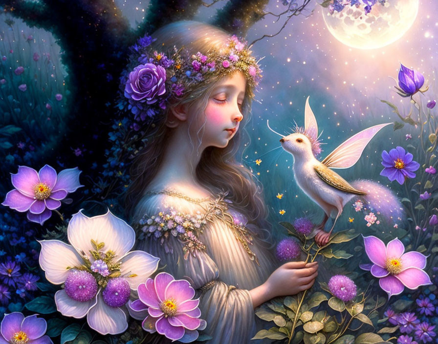 whimsical flower fairies in the garden, the silver crescent shines dimly, the night is brightened up by the moonflowers in the garden, in the style of Jean Baptiste Monge, whimsical, fantasy