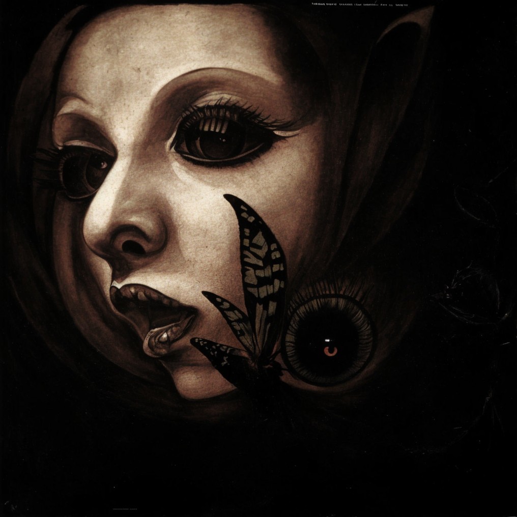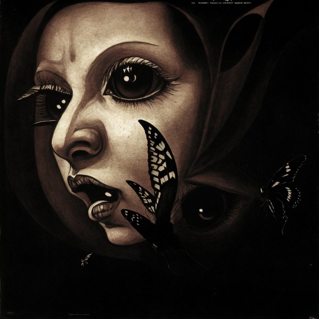 A surreal artwork showing a face with multiple eyes and butterflies, in monochromatic tones, evoking an eerie and mystical atmosphere.