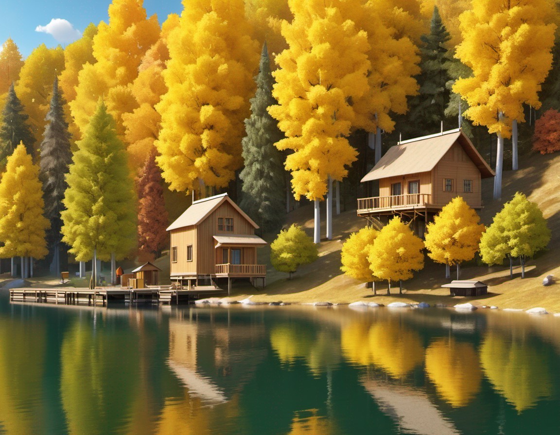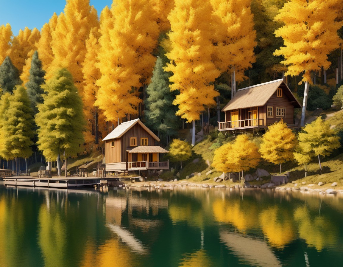 A serene autumn scene with a wooden cabin by a lake, flanked by trees with vibrant yellow and orange leaves reflecting on the water.