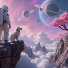 An astronaut and a dog stand on a rocky outcrop, gazing at a breathtaking cosmic landscape filled with colorful planets, a vibrant sky, and ethereal clouds, framed by cherry blossom trees.