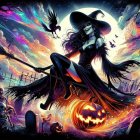 A black witch flies on her broomstick, surrounded by swirling colors, a glowing pumpkin, and playful skeletons. Dark clouds and a raven enhance the enchanting Halloween scene.