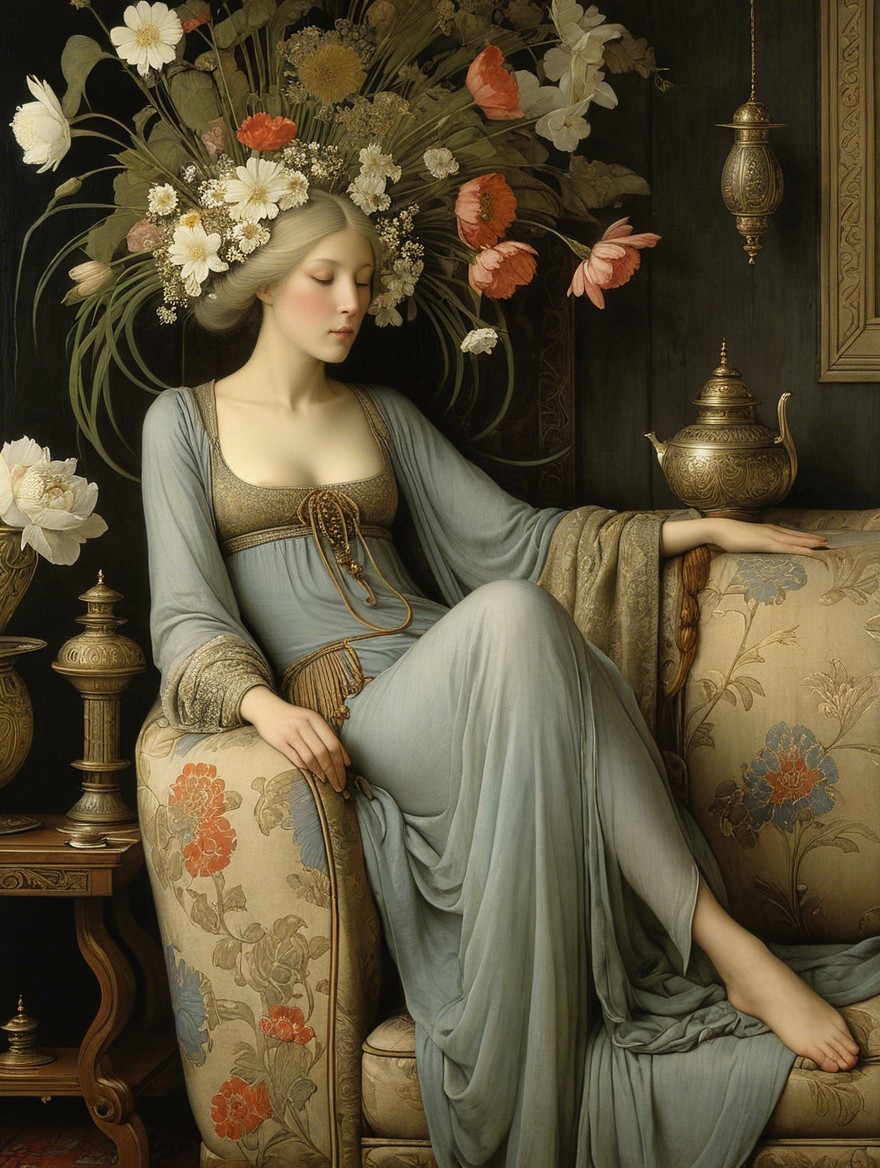 A serene woman in a flowing blue gown lounges gracefully on an ornate couch, adorned with a floral crown, exuding elegance and tranquility in a richly decorated vintage setting.