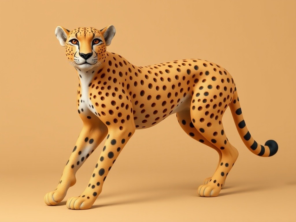 A digital artwork of a cheetah with prominent spots and muscular build, depicted in a poised stance against a soft grey background.