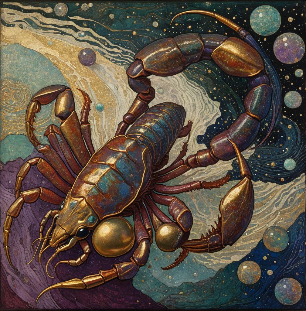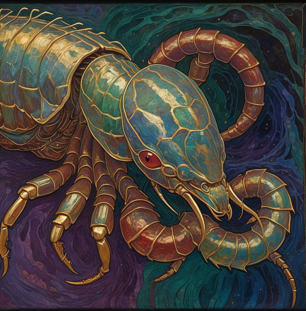 The image depicts a highly detailed, stylized lobster with vibrant turquoise and purple colors, set against a deep blue background, showcasing intricate textures and metallic sheen.