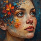 A portrait of a young woman with striking blue eyes and flowing hair, surrounded by vibrant flowers in shades of orange and blue, evoking a sense of natural beauty and tranquility.
