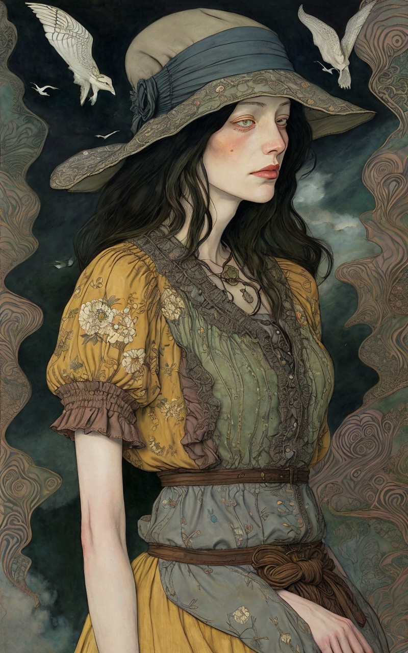 Captivating Woman in Dark Gown Against Mystical Backdrop