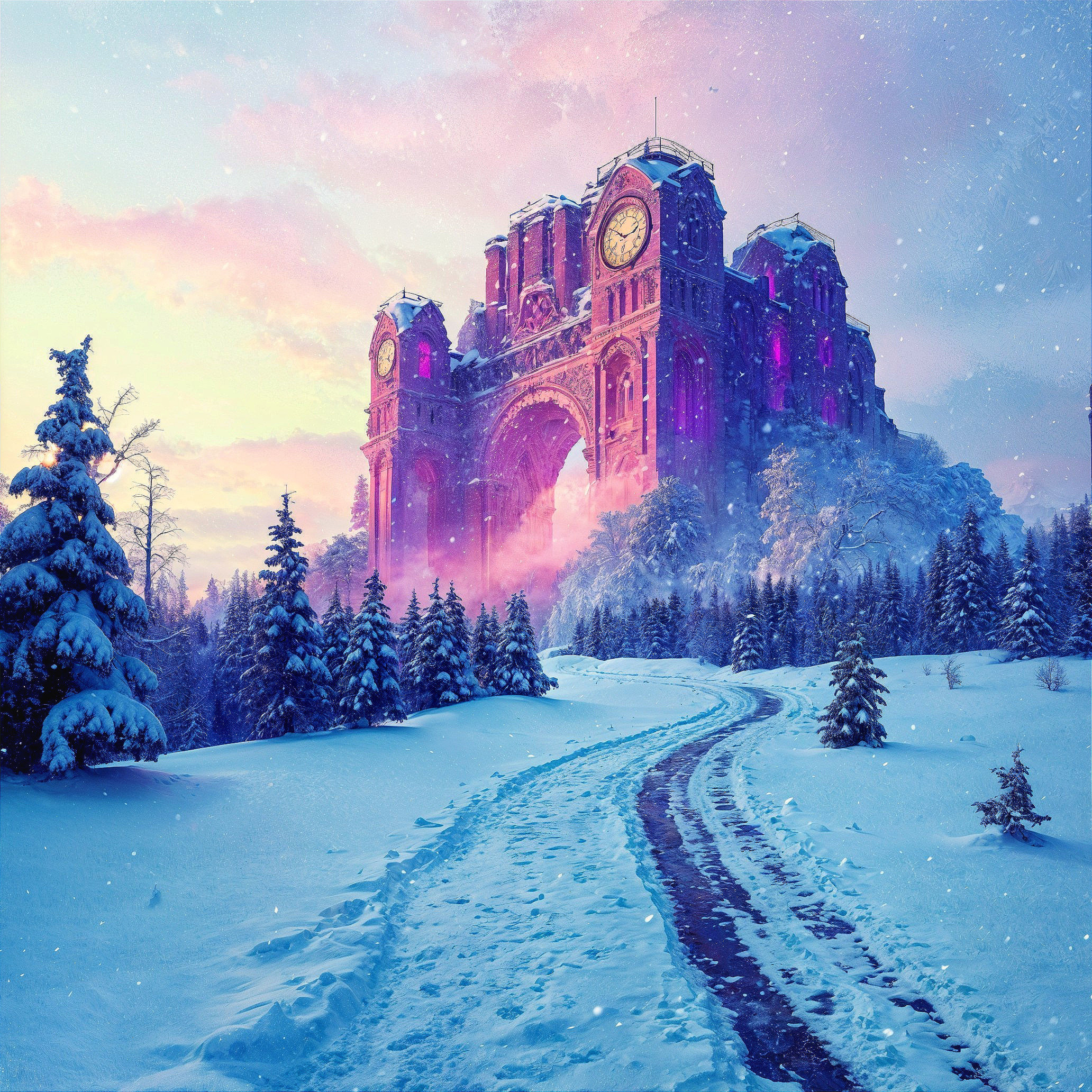 Majestic archway with intricate stone carvings, clock towers reaching towards the sky, and neon pink glowing accents that cast a warm, otherworldly glow, stands regally amidst a serene snowy landscape. Soft, feathery evergreen trees, their branches heavy with snow, line a winding path that disappears into the tranquil atmosphere. An abstract impression of a pastel sunrise peeks through the clouds, infusing the scene with a dreamy, ethereal quality. The soft, diffused light illuminates the snow-covered terrain, casting long shadows and creating an enchanting winter wonderland. Inspired by the impressionist masters, Monet and Van Gogh, this digital painting blends traditional techniques with modern flair, evoking the trending styles of Artstation, in breathtaking 8K, full HD resolution, with vibrant colors and delicate textures that invite the viewer to step into the serene, magical world.
