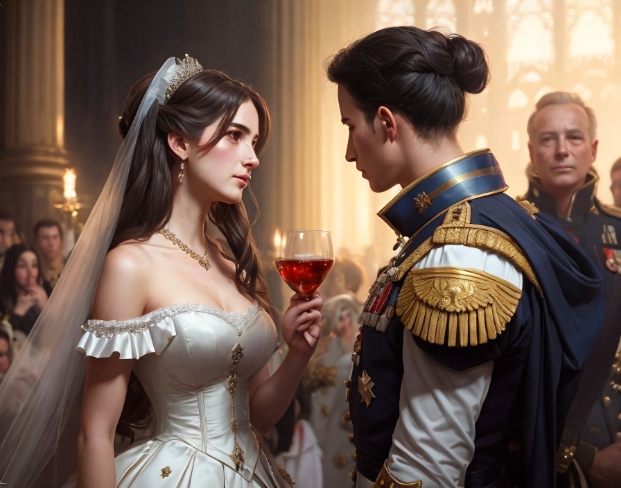 Bride and groom in white gown and military uniform with wine glasses in ornate room