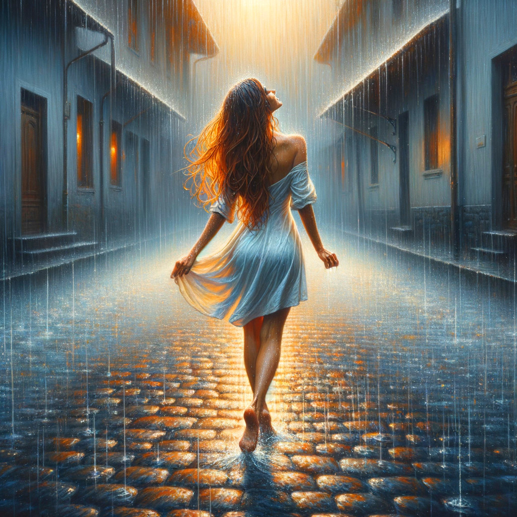 A woman in a flowing white dress walks barefoot down a rain-soaked cobblestone street. Sunlight breaks through the clouds, creating a magical, dreamlike atmosphere around her.