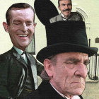 The image features three caricatured figures wearing formal attire, with exaggerated facial expressions. They have playful smiles, suggesting a whimsical or humorous theme. The background is abstract. Holmes, Dr Watson and Moriarty having a laugh together.