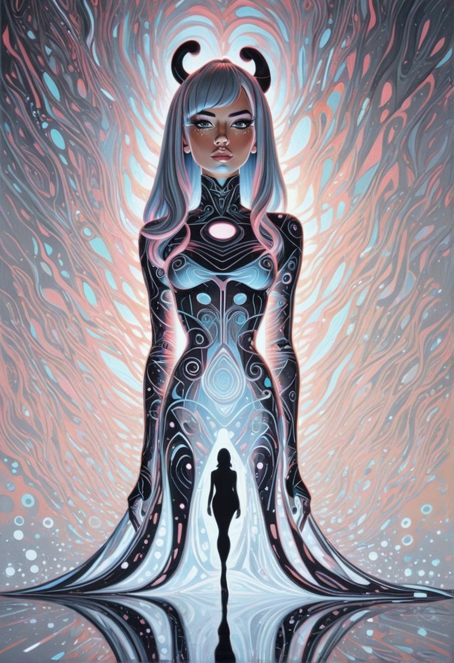 Prompt: Feminine futuristic foampunk portrait, stylized female full body portrait, abstract sci-fi elements with bold outlining with naive art featuring geometrical 3D effects, linocut by Brock Hofer, black brushstrokes adding depth, dyed by Man Ray, flowing hair illusion with grey and dark streaks, encoustic line-art, several textured layers, headshot reminiscent of Lawrence Schwinger and Overton Loyd, female diva, line-art, HD quality, stylized rendering, traumacore 1.9, foampunk 1.5, subtle coloring 1.9, comic book art Infused with Gothic pen and ink details, diffusion, displacement mapping, dendritic structures chiseled in abstract linework, plasticity 1.6, complexion1.2, otherworldliness, half-lit pores, fine lines, natural painterly effects, visible dotted skin texture, audacious, brazen coloring, serene, bold outlines, presumptuous imaginative absurdism, detailed neck and throat, strong gradient pink inking colors reminiscent of Leonora Carrington and Ed Binkley merged with stylized collagraphy inspired by Stan Lee's comic book art, tesselated, tints in red gradients, multi-layered composition, subsurface scattering 1.4, raytraced shadows 1.8, divisionism, micro-level intricacy, parallax occlusion 1.3, large-scale complexity, colorful line-art by William Bradley, several linework patterns, otherworldly, 5 layers of dof, flowing line-art by William Bradley, hues by Ho Baron and Ed Binkley, warm coloring, dynamic lighting 1.3, intricate, catenaries, delicate, revealing, lascivous, divisionism, diverse atmosphere, intricate bas-relief effects, blurred background, contoured, dyed, debeh, bokeh, dof, lavish, unique, warm coloring with ink lines over watercolor effects, tesselated, stylized, watercoloring techniques, tousled, overexposed, brightness 1.3, pen and ink, posing, motility, quillling, accentuated with crisp quality. tribal complementary colored patterns, thinned paint for 3D effects, acidic washes in reddis tones, casually textured layers, intricate line art utilizing watercolor and blotting quill pen techniques, gradient inking colors of warm gradient tones, squiggly parallax occlusion, alt-cinema, texture mapping, serene, colorful irregular hatching, depth and complexity, ambient occlusion 1.4 , complex layered composition in a magical fantasy style, bold black ink linework,, bidirectional reflectance distribution, phong shading, handsome sketch art approach by Lawrence Pelton,impossible light transitions, emulsion lifts, linework fcontoured, tactile feel, simplistic features, intricate detailing, warm colors as stacked lines, industrial design, sgrafitto reminiscence, parallax occlusion for structured brightness 1.5 and visible textures, quaint, fusion of geometrical styles with elements of protopunk, detailed line art to create a whimsical and psychedelic ambiance, traumacore with fantasy elements, precise execution influenced by Stan Lee and Ho Baron's psychedelic style, simplistic color scheme, op-art inspired by Georges Seurat and Man Ray. Incorporate intricate patterns, neon pink details, warm 3 point lighting,