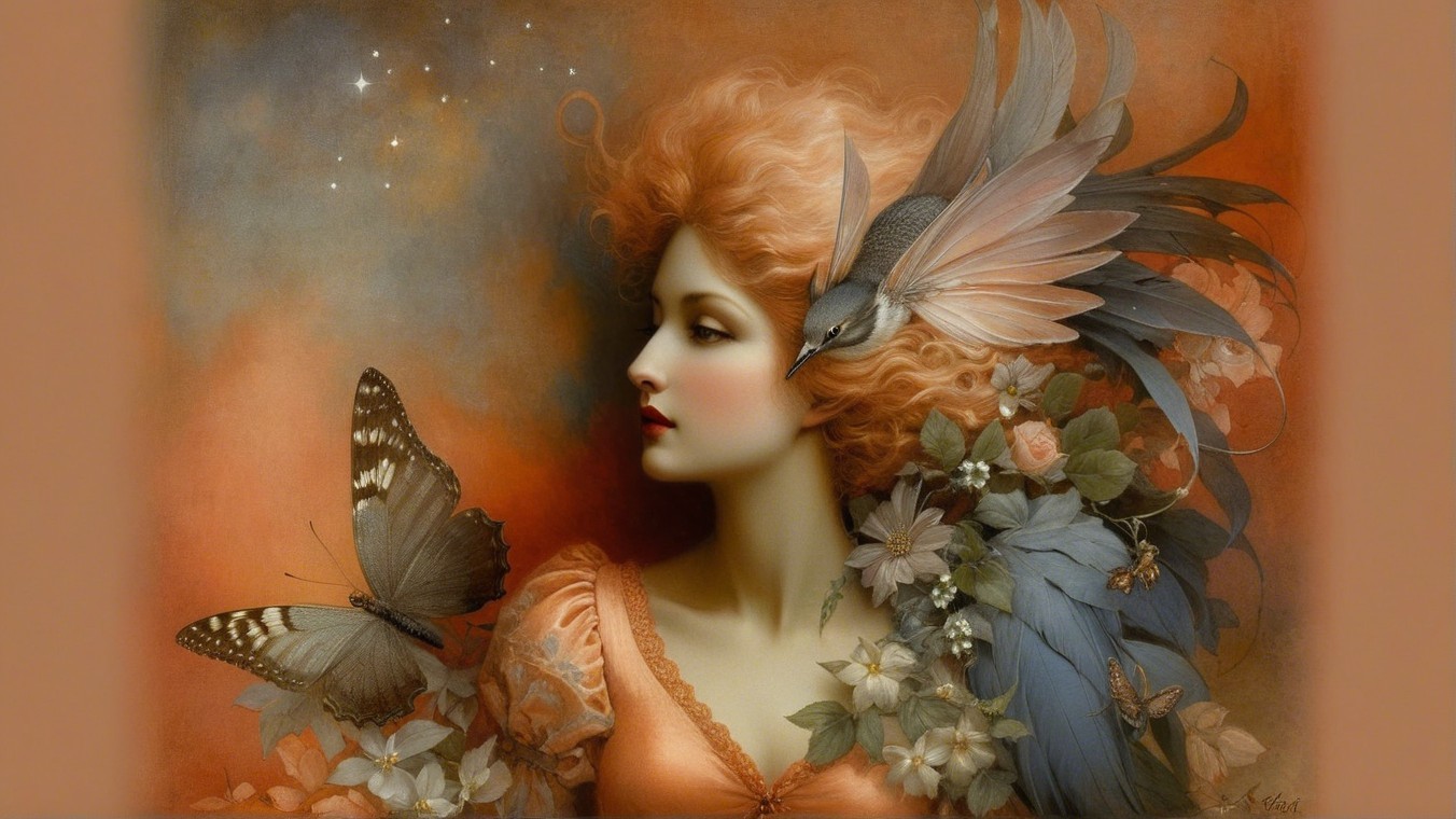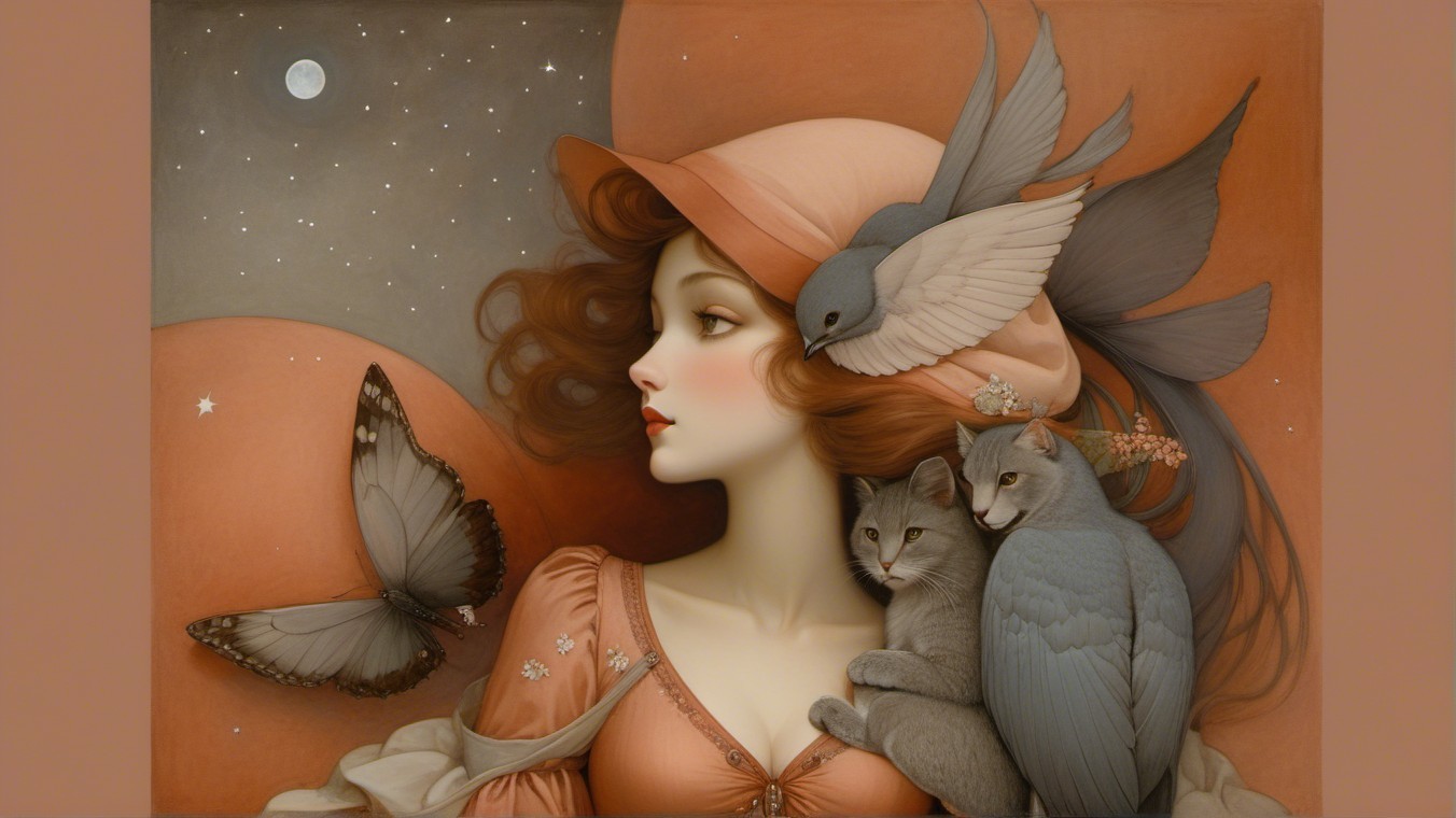 A graceful woman in a wide-brimmed hat adorned with feathers and flowers stands against a backdrop of autumn leaves. A playful squirrel watches her as the moon rises in a serene twilight scene.
