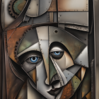 The image features a stylized, abstract face composed of geometric shapes and muted colors. It showcases striking blue eyes and intricate detailing, evoking a sense of depth and emotion.