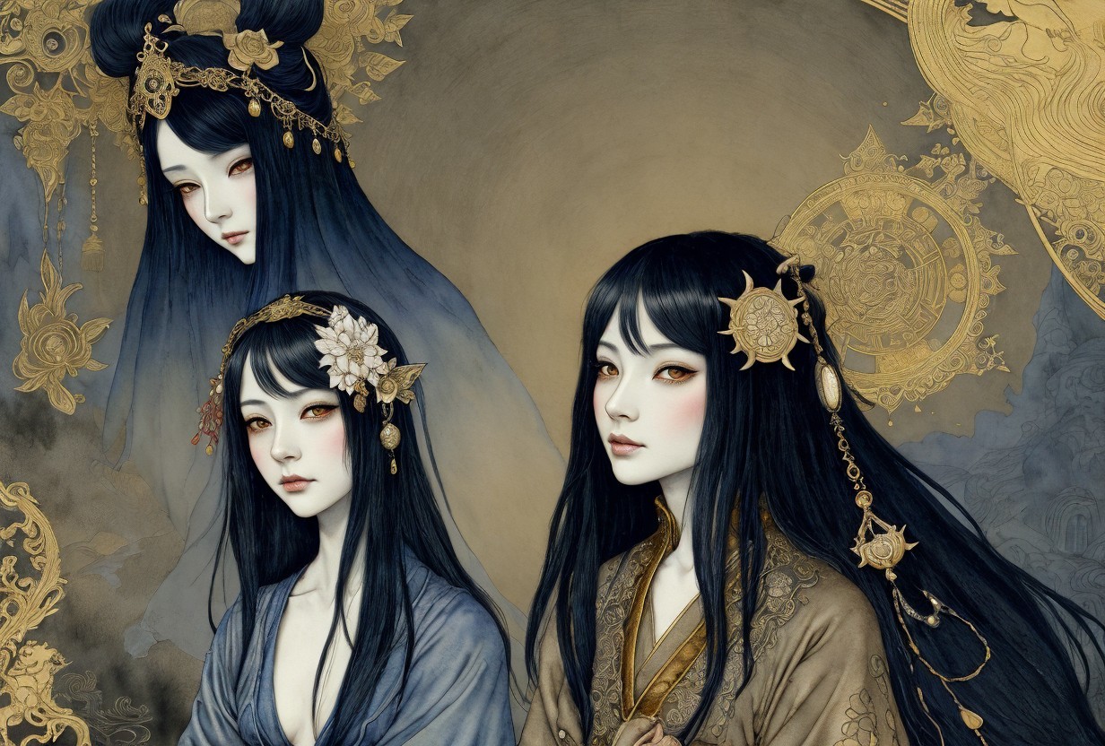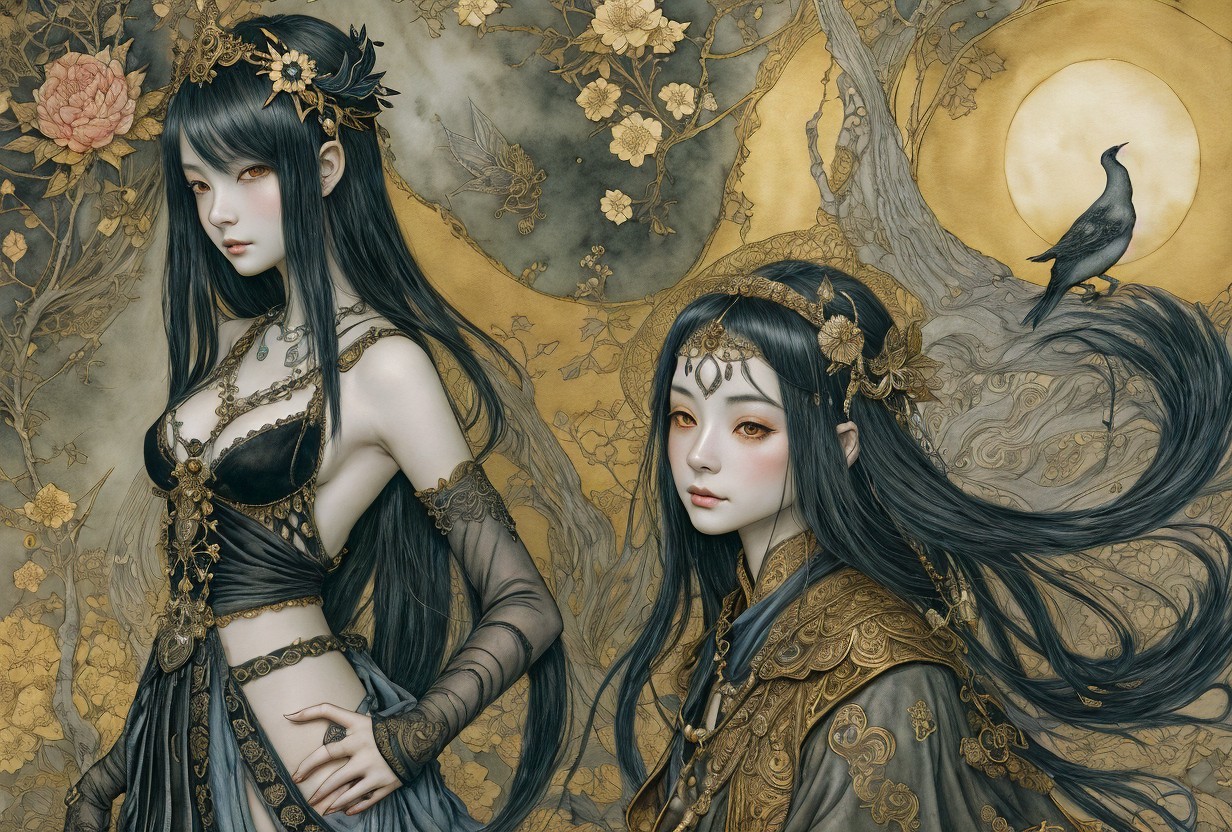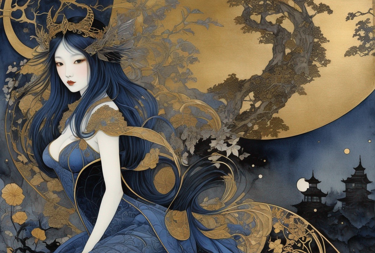 Legend of the dark nymph of the underworld. Medieval Japanese Artists Sumi-e Style, Velvet Black, Shabby, indigo, Dull Gold, Amber Gray, Golden Ratio, Surreal Fantasy, Elegant, High Definition Ultra Fine 3D Line, Zenangle Style, Watercolor Patchwork ,