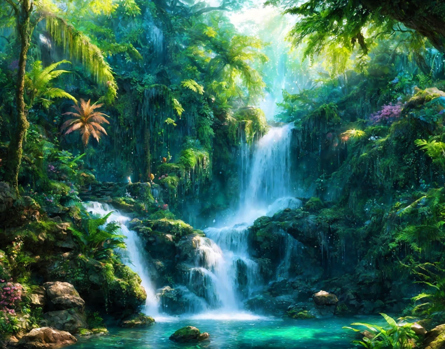 An enchanting fantasy landscape with waterfalls, a lush forest, a serene pond, and a fairy-tale castle amidst vibrant flora.