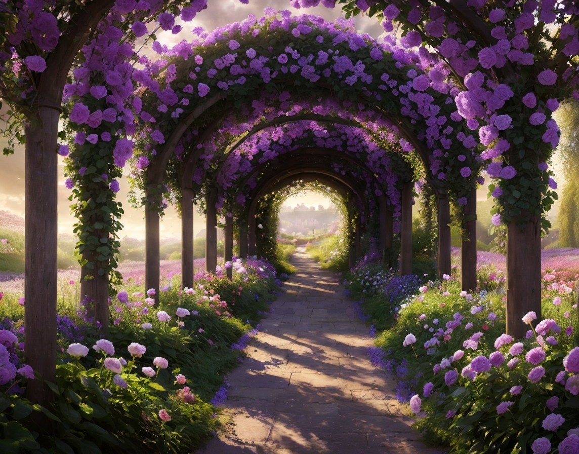 Prompt: a picturesque garden, in the form of a tunnel of plants, with a path through this tunnel, drooping purple flowers, at the end of the tunnel a view of a field of flowers, flowers, birds, a fabulous atmosphere, a beautiful evening sky